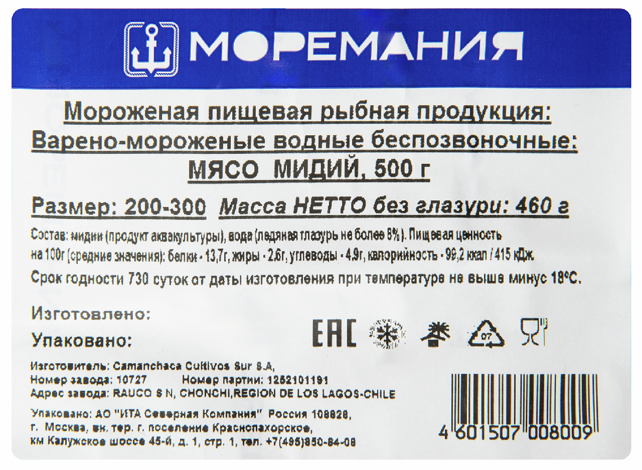 Мясо мидии Моремания 200/300 вареное замороженное, 500г