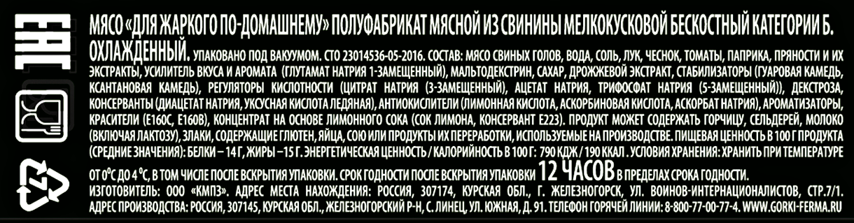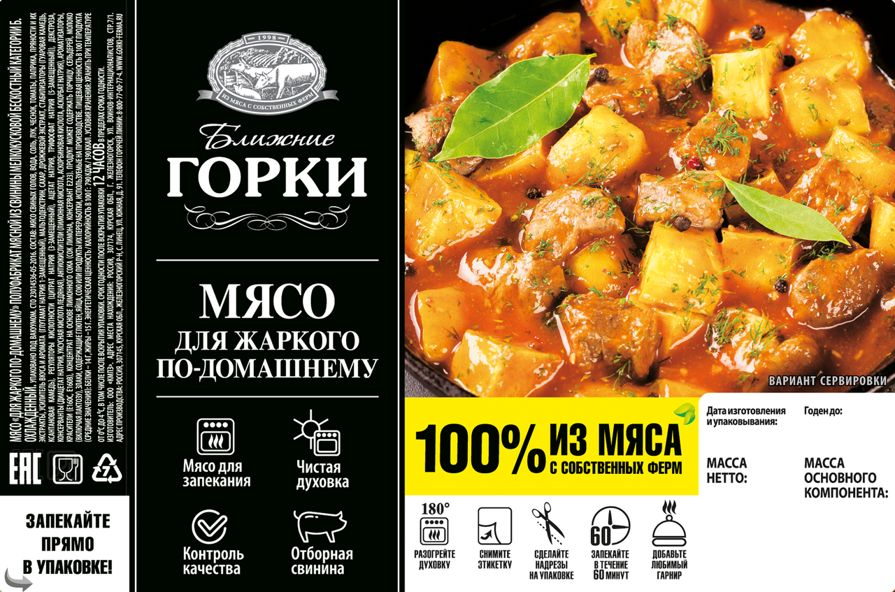 Свинина для жаркого Ближние горки По-домашнему - необычайно нежное мясо в густом соусе по классическому рецепту. Мясо замариновано с красным перцем, луком, ароматным чесноком и душистым укропом. Свинина получается сочной и ароматной после приготовления.