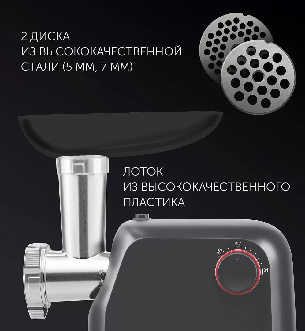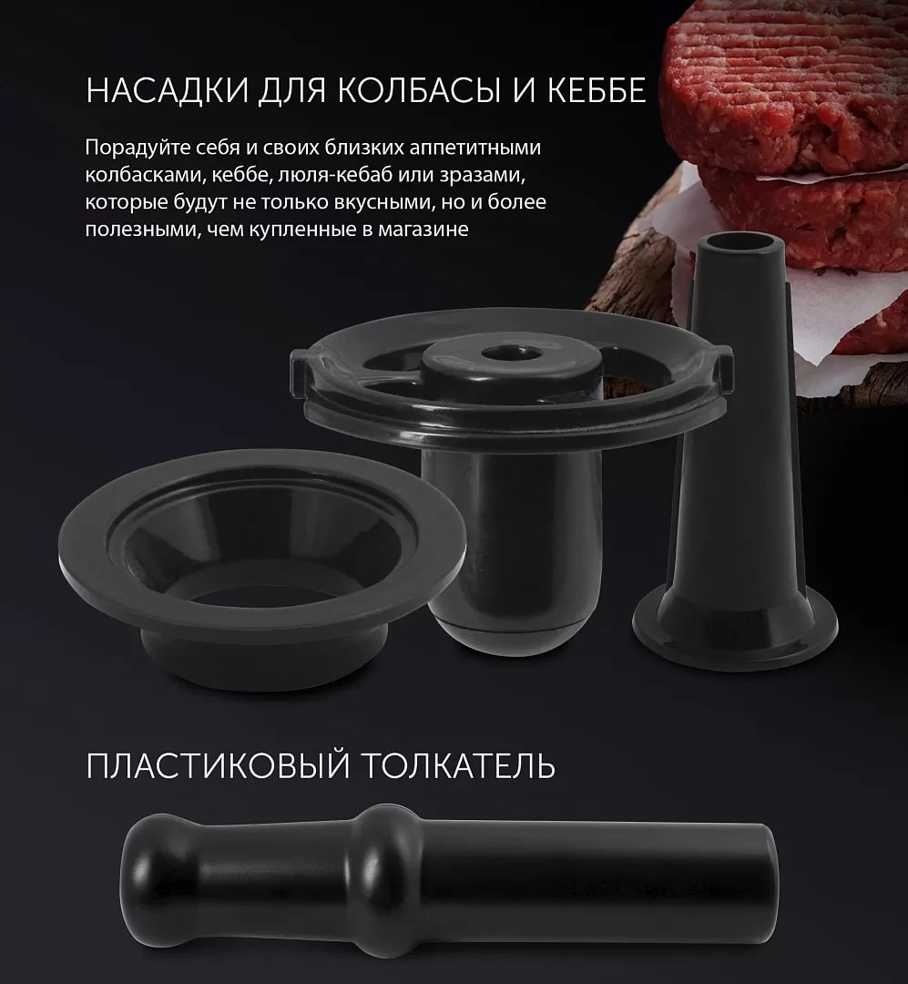 Технология PROtect+.Дополнительная защита двигателя от перегрузки.Нескользящие ножки.Мощность 1800 Вт.В комплекте:- 2 решетки из высококачественной стали (5 мм, 7 мм);- лоток для мяса из высококачественного пластика;- пластиковый толкатель;- насадка для приготовления колбас;- насадка для приготовления кеббе.