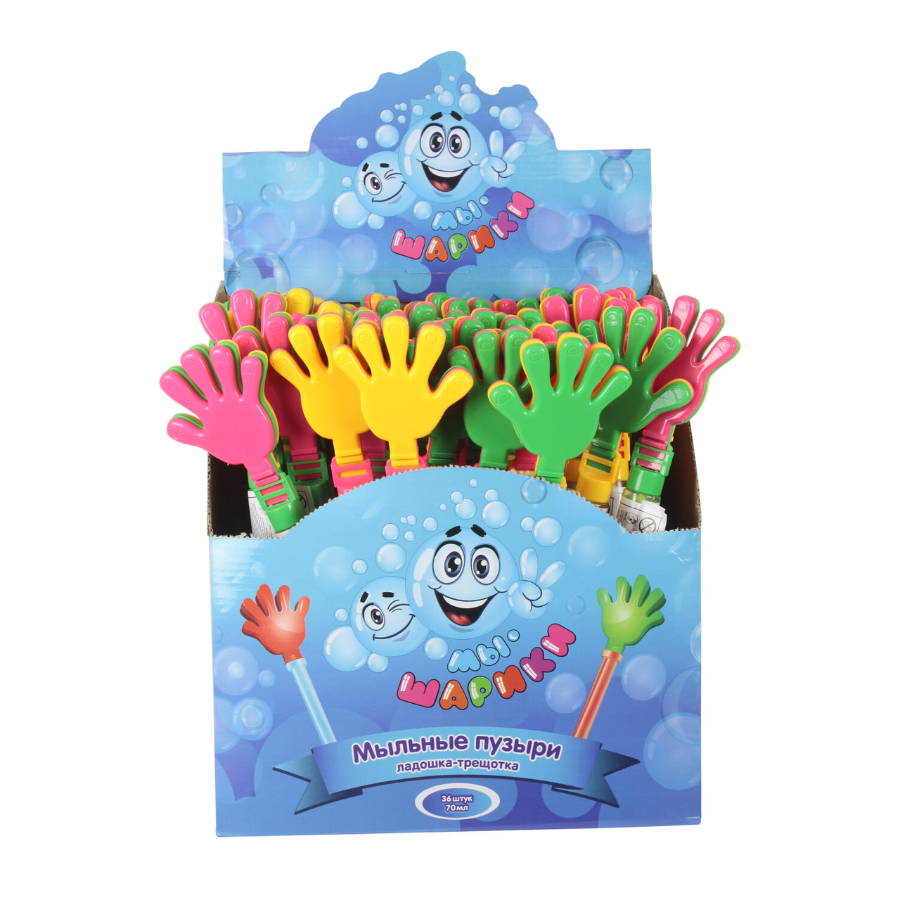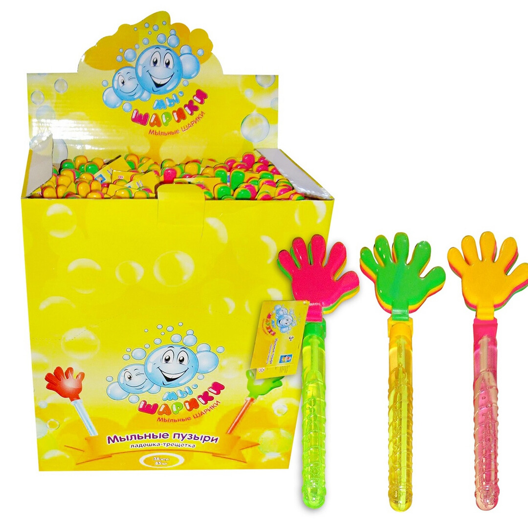 Игрушка для пускания мыльных пузырей для мальчиков и девочек выполнена в виде емкости с ладошкой-трещеткой на конце. Макаем приспособление для надувания мыльных пузырей в мыльный раствор и выдуваем мыльные пузыри.
