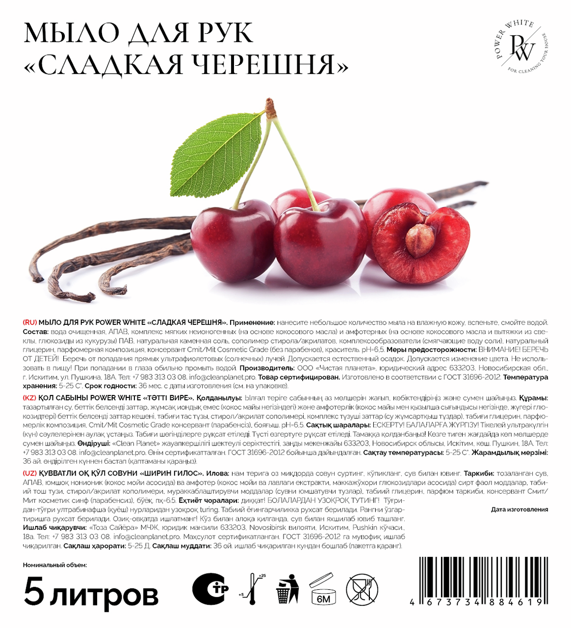 Мыло жидкое Power White Сладкая черешня, 5л