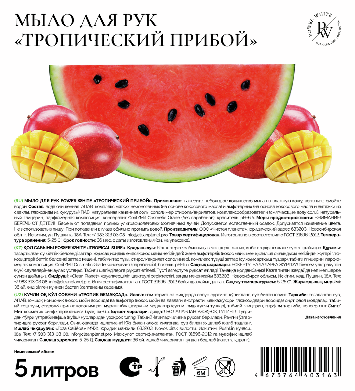 Мыло для рук. Содержит глицерин и сделан с добавлением биоразлагаемых ПАВ. Эффективно устраняет грязь и бактерии, имеет правильную реалогию без желеобразной консистенции. Отлично очищает кожу рук, не оставляя ощущения сухости. Нейтрализует неприятные запахи. Способ применения: нанесите небольшое количество мыло на влажную кожу, добейтесь образования пены, смойте водой.
