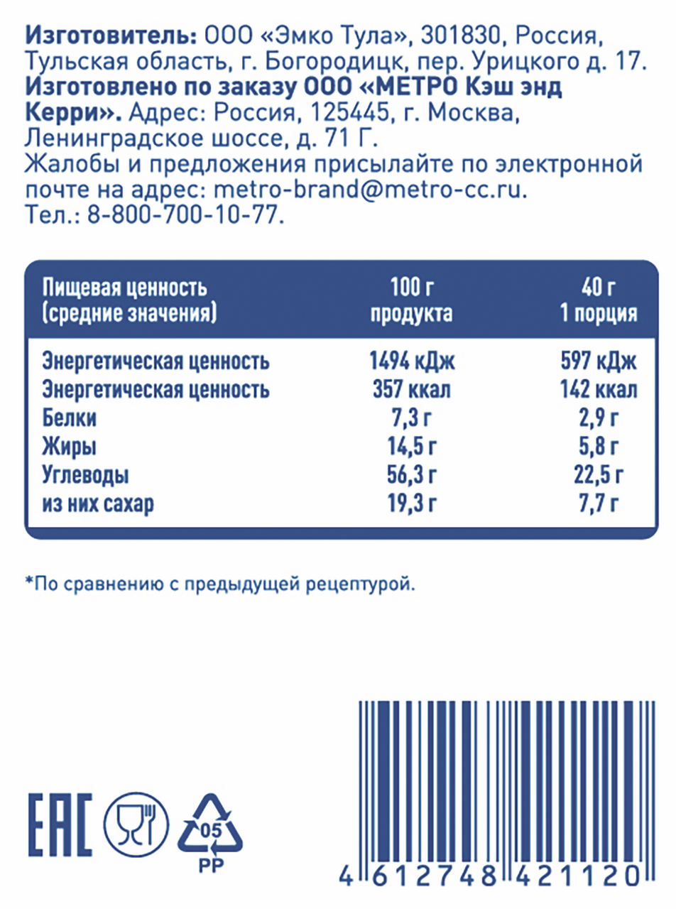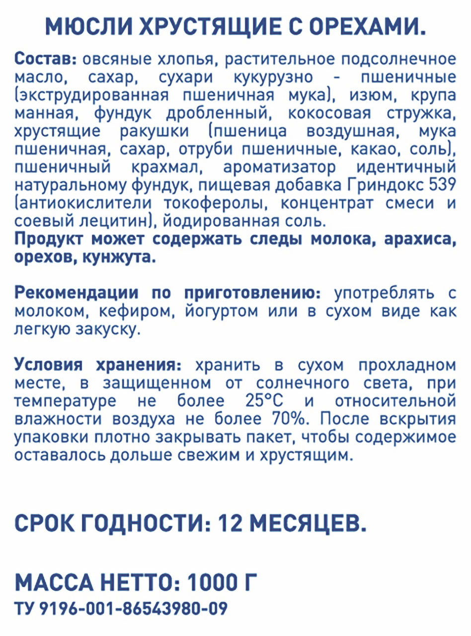 Овсяные хлопья, сахар, растительное подсолнечное масло, сухари кукурузно-пшеничные (экструдированная пшеничная мука), изюм, крупа манная, фундук дробленый, кокосовая стружка, хрустящие ракушки (пшеница воздушная, мука пшеничная, сахар, отруби пшеничные, какао, соль), пшеничный крахмал, ароматизатор идентичный натуральному фундук, пищевая добавка Гриндокс 539 (антиокислители токоферолы, концентрат смеси и соевый лецитин), йодированная соль. Продукт может содержать следы сухого молока, миндаля, кунжута.