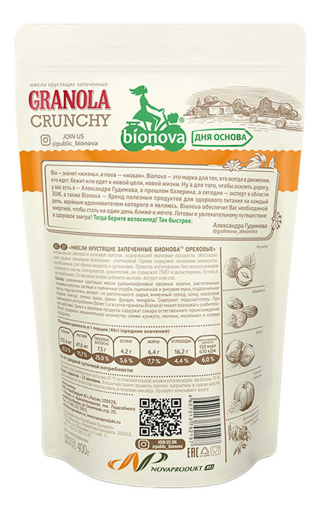 Мюсли-кранч Bionova ореховые, 400г