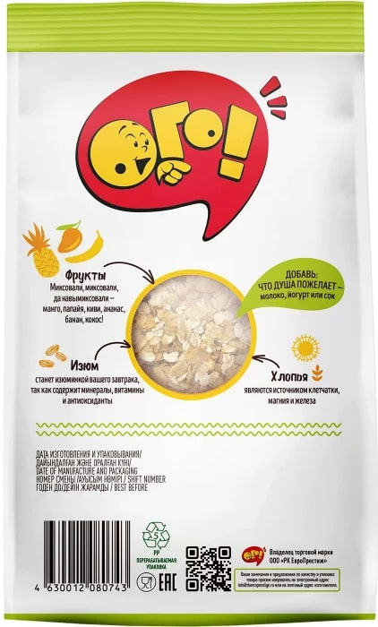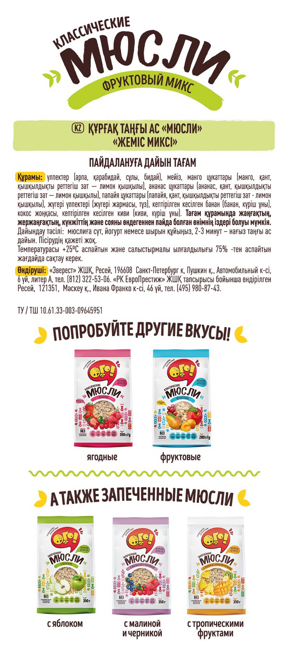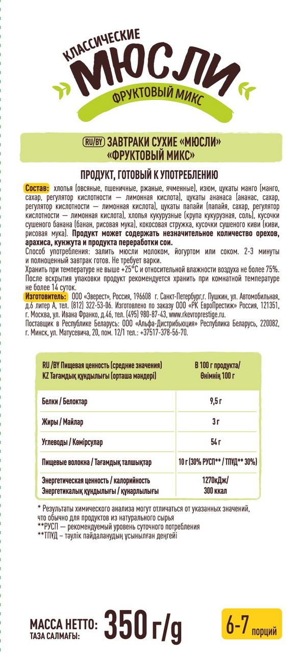 Кокосовая стружка, киви, овсяные хлопья, хлопья пшеничные, яблоко, хлопья ржаные, абрикос сушеный, изюм, банан сушеный, груша сушеная, ананаса цукаты, кукурузные хлопья, ядра семян подсолнечника, чипсы банана, хлопья ячменя, крупа кукурузная, соль йодированная содержит йодат калия, агент антислеживающий ферроцианид калия. Без добавления сахара.