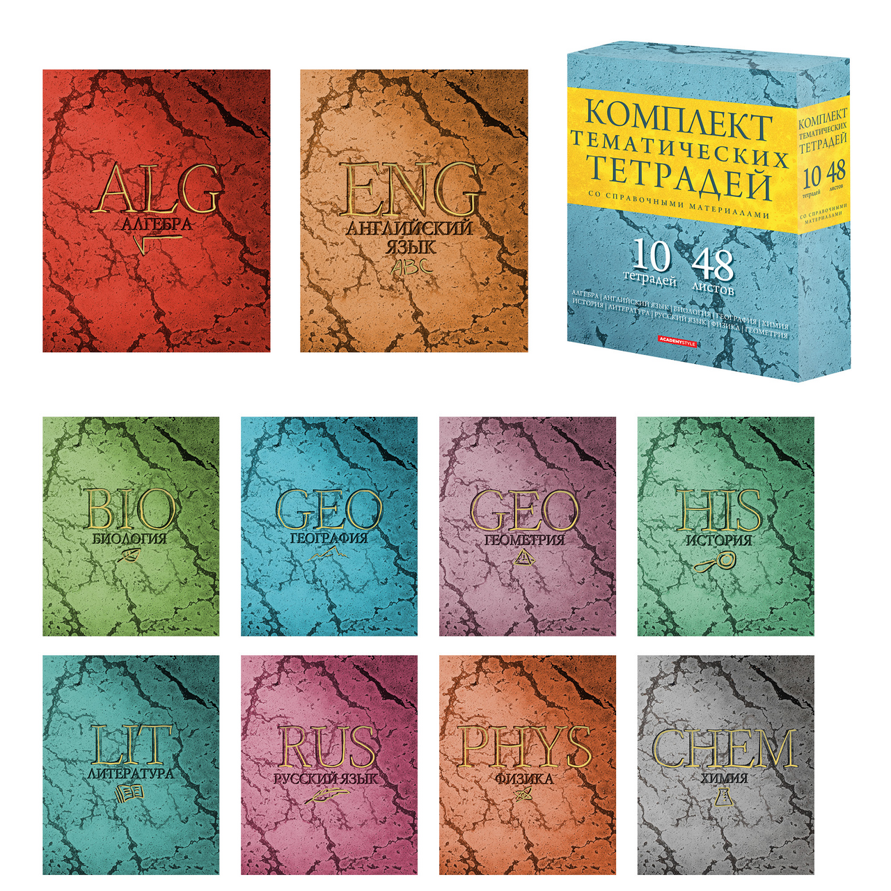 Комплект тематических тетрадей со справочным материалом, 10 предметов (10 шт) : алгебра,русский язык , биология,география, геометрия, история, литература, английский язык,физика, химия . Обложка тетради с эффектом УФ лака.