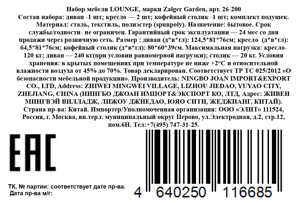 - Тип Комплект садовой мебели
