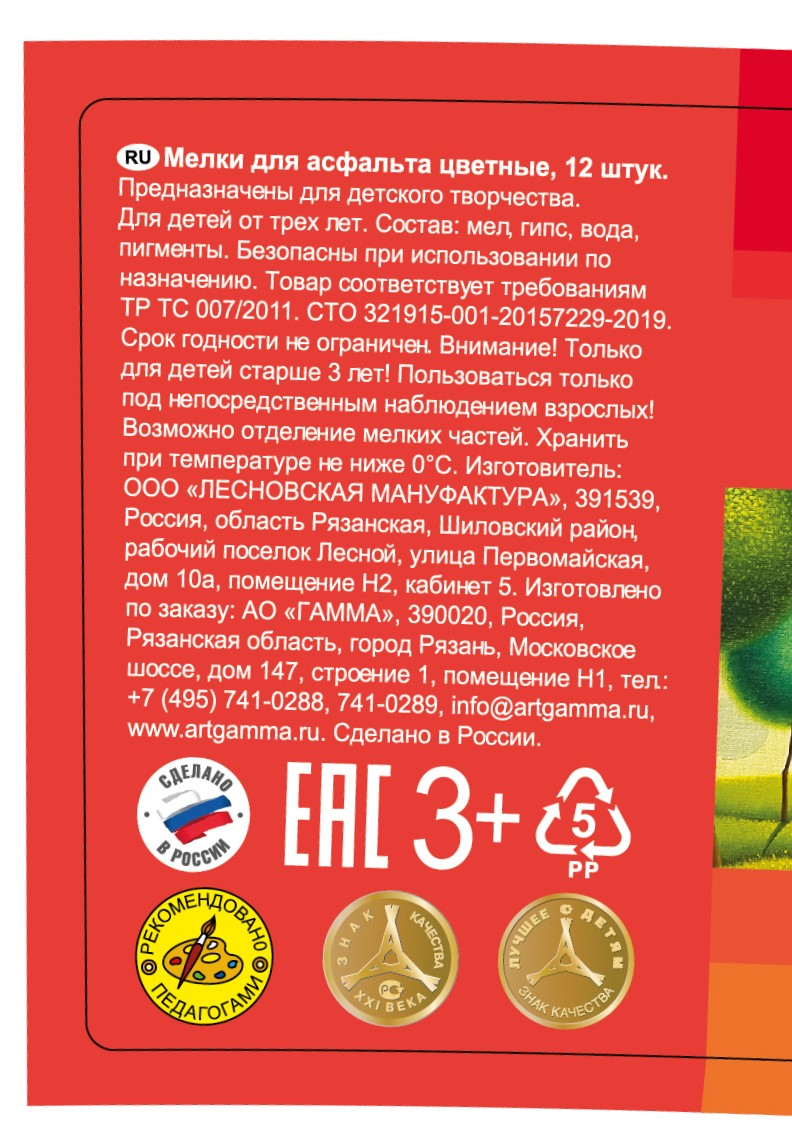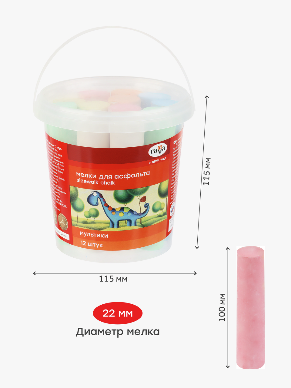 Мелки для рисования на асфальте 6 цветов Гамма серии Мультики подходят для рисования на любой шероховатой поверхности. Набор состоит из 6 цветов: белый, желтый, зеленый, синий, красный, оранжевый. Длина - 10см, диаметр - 22мм. Мел удобно лежит в руке, не царапает рабочую поверхность и не пылит при письме. Не имеют выраженного запаха. Следы мелков легко очищаются с рук.