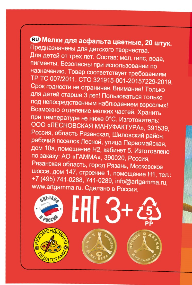 Набор из 20 круглых мелков Гамма серии Мультики подходит для рисования на асфальте и любой шероховатой поверхности и состоит из 6 цветов: 2 белых, 4 желтых, 4 зеленых, 4 синих, 4 красных, 2 оранжевых. Длина - 10см, диаметр - 22мм. Мел удобно лежит в руке, не царапает рабочую поверхность и не пылит при письме. Не имеют выраженного запаха. Следы мелков легко очищаются с рук.