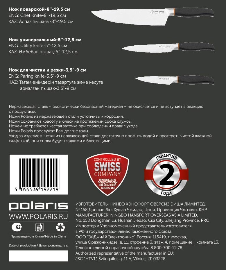 Двусторонняя заточка лезвий. Материал клинка - нержавеющая сталь X30Cr13, материал рукоятки - ABS пластик. Ice Hardening technology - уникальная трехэтапная технология закаливания ножей, что обеспечивает особую прочность. Ножи долго держат заточку. Твердость по шкале Роквелла 542 HRC. Высокая сопротивляемость деформации. Эргономичная форма рукоятки обеспечивает удобный захват инструмента и безопасность при работе. Жесткое заклепочное крепление обеспечивает долговечность. Цельнокованый нож отвечает самым высоким санитарным требованиям. Можно мыть в посудомоечной машине. Гарантия - 2 года. Нож поварской - 8 градусов - 20см. Нож универсальный - 5 градусов - 12,7см. Нож для чистки и резки - 4 градуса - 10,16см.