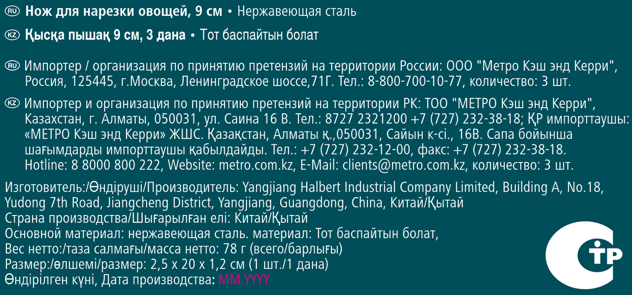 METRO PROFESSIONAL Набор ножей 3 шт для овощей 10см удобны в применении. Они остро заточены. Лезвие тонкое и прочное, с режущей кромкой. Ножи изготовлены из прочной стали, нержавеющей и не подверженной коррозии. Изделия рассчитаны на длительное использование. Лезвие не подвержено влиянию внешних факторов. Оно не выделяет вредных веществ при контакте с продуктами, не впитывает запахов и не меняет их вкусовые качества. Ножи можно использовать для нарезки и чистки овощей. После работы промывают под проточной холодной или горячей водой. Помещать его в посудомоечную машину не рекомендуется. Разрешается использовать различные моющие средства.
