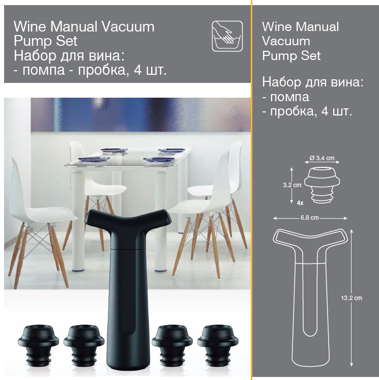 Это незаменимый помощник для всех ценителей вина и коктейлей. Этот барный набор надолго сохранит их аромат и вкус напитков в бутылке. Вакуумные пробки помогут удалить воздух из бутылки, предотвращая окисление и обеспечивая свежесть напитка, что особенно важно для ценителей качественного вина. Комплект включает в себя высококачественные пробки, которые просто и удобно устанавливаются на горлышко бутылки. С помощью специальной помпы вы сможете эффективно вытянуть воздух, что позволит сохранить свежесть вина. Благодаря компактному размеру и легкому весу, эти аксессуары легко помещаются в любой барной стойке или кухонном шкафу.