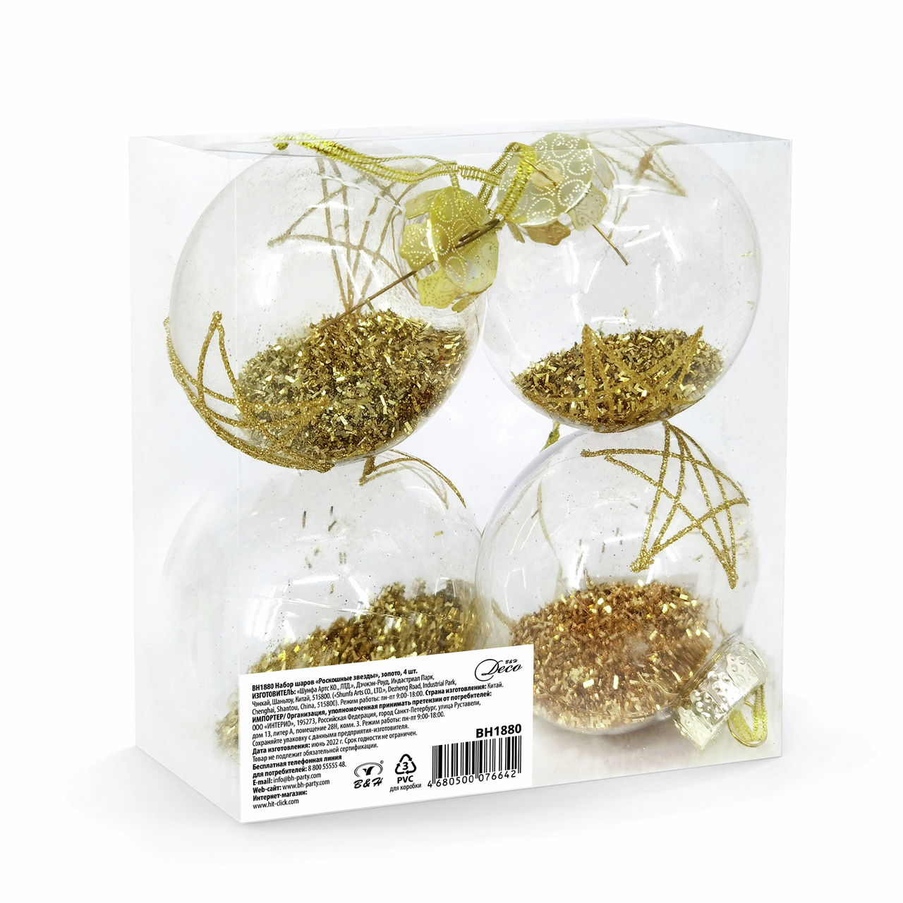 Набор елочных шаров B&H Роскошные звезды золотой 8см, 4шт