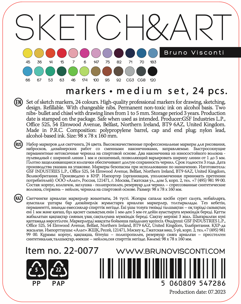 Необычные скетч-маркеры из серии Sketch&Art имеют эргономичную треугольную форму и дизайнерский рисунок на корпусе. Два классических наконечника: пулевидный (от 1 мм) и клиновидный (5 мм). Большой запас чернил на спиртовой основе со сроком хранения 4 года. Идеально прилегающие колпачки обеспечивают долгий срок службы. Главное, не забывайте их закрывать! Используйте бумагу разной гладкости и плотности для создания эффектных рисунков. Чем более гладкая у вас бумага, тем больше появляется возможностей для быстрого смешения цветов и создания градиентов. Попробуйте нанести рисунок на стекло или светлый пластик (предварительно обезжирив поверхность). Вы удивитесь стойкости и яркости результата. Экспериментируйте с поверхностями и форматами! Если вы случайно испачкали скетч-маркером руки или одежду, не переживайте, все отстирывается и отмывается с моющим средством.
