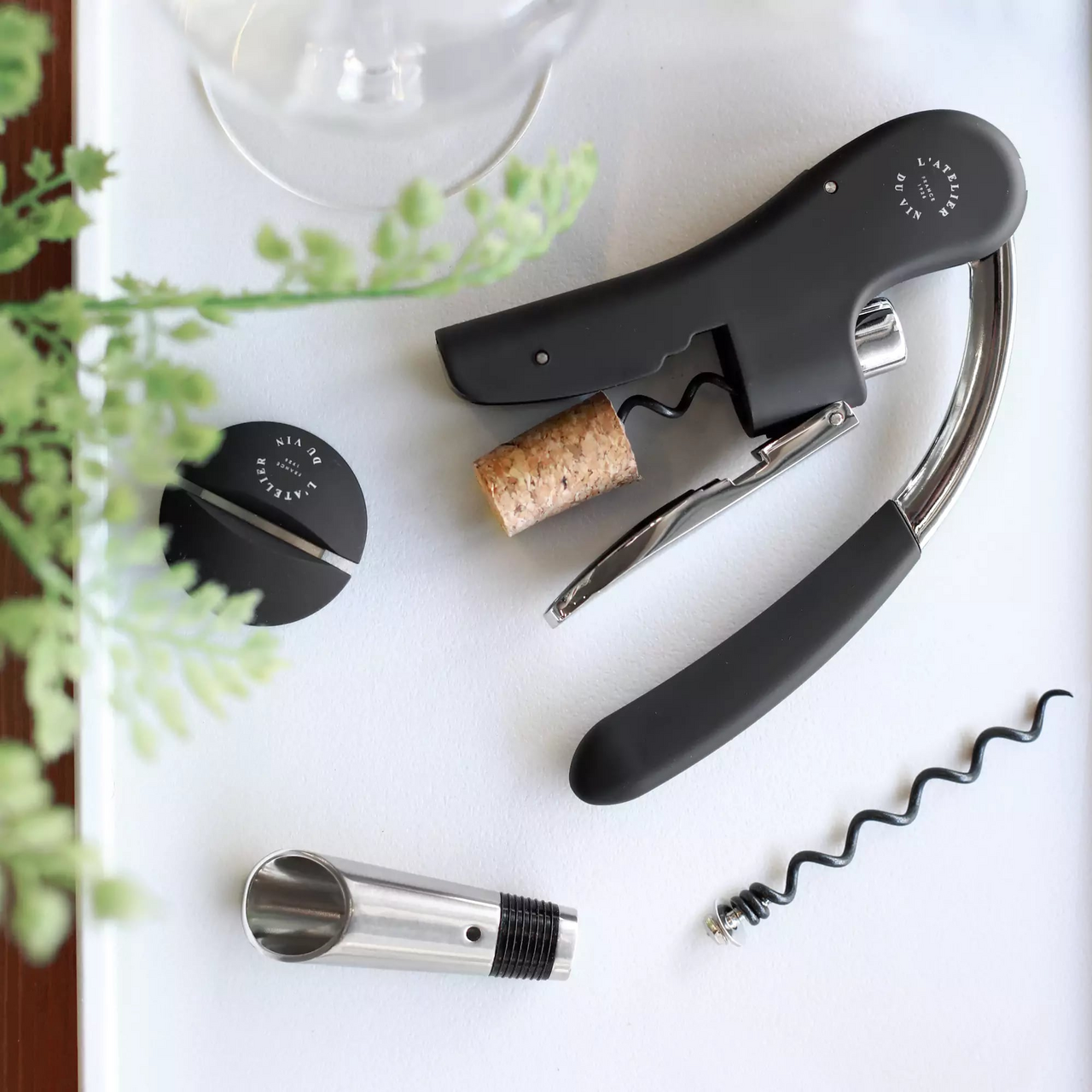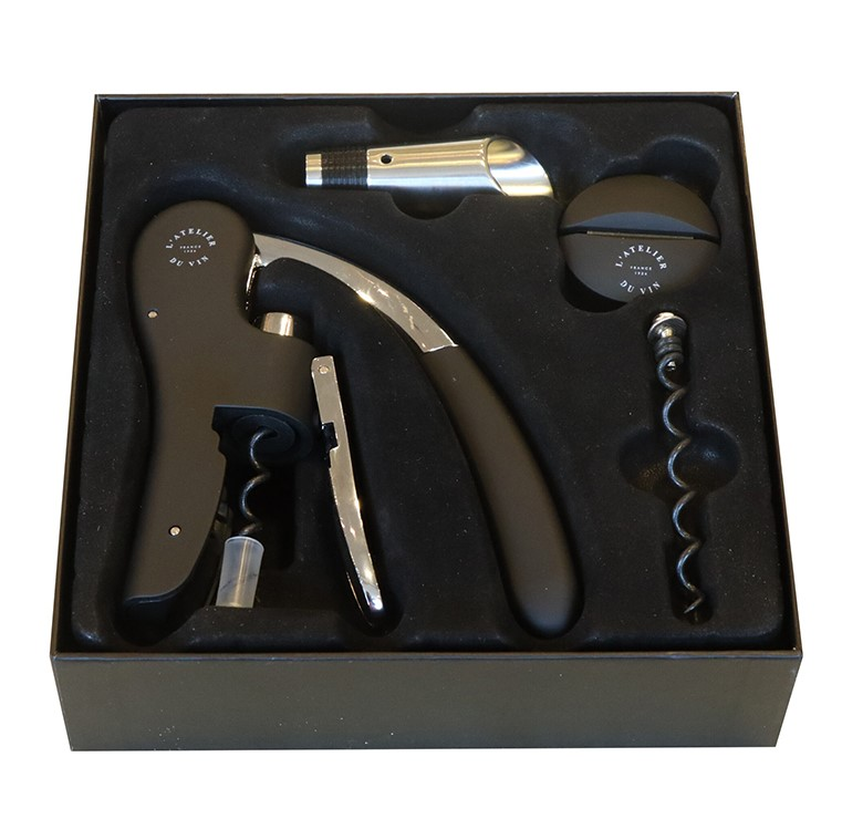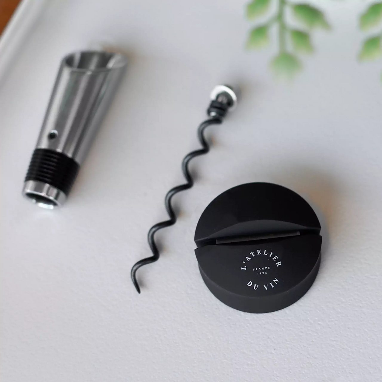 Изготовлен из практичных, современных материалов и отличается долговечностью и простотой ухода. В набор L'Atelier du vin входят пять предметов: штопор, 2 пробки, открывалка. Аксессуары находятся в подарочной коробке из дерева и станут прекрасным приобретением для дома, бара или презентом для ценителя вин. Все аксессуары выполнены из высококачественных материалов, таких как металл, пластик и силикон, что обеспечивает долгов��чность и надежность использования.