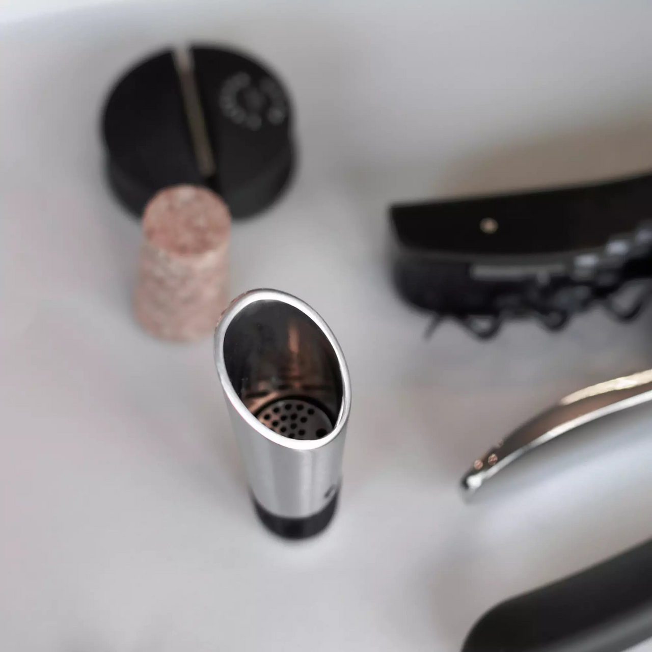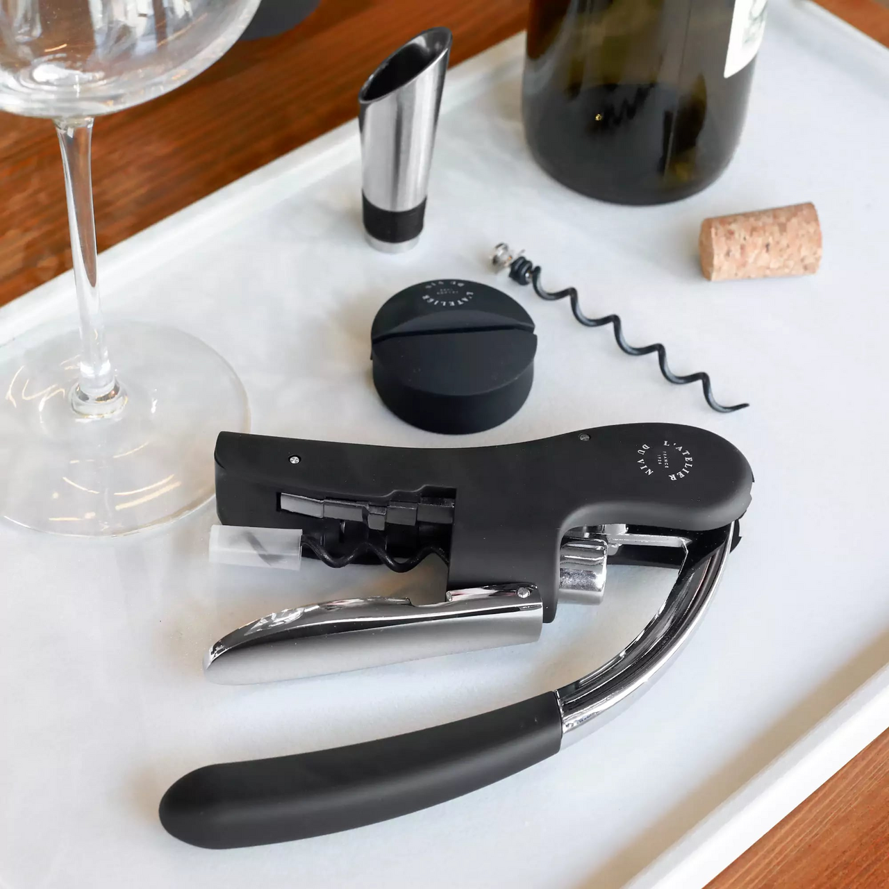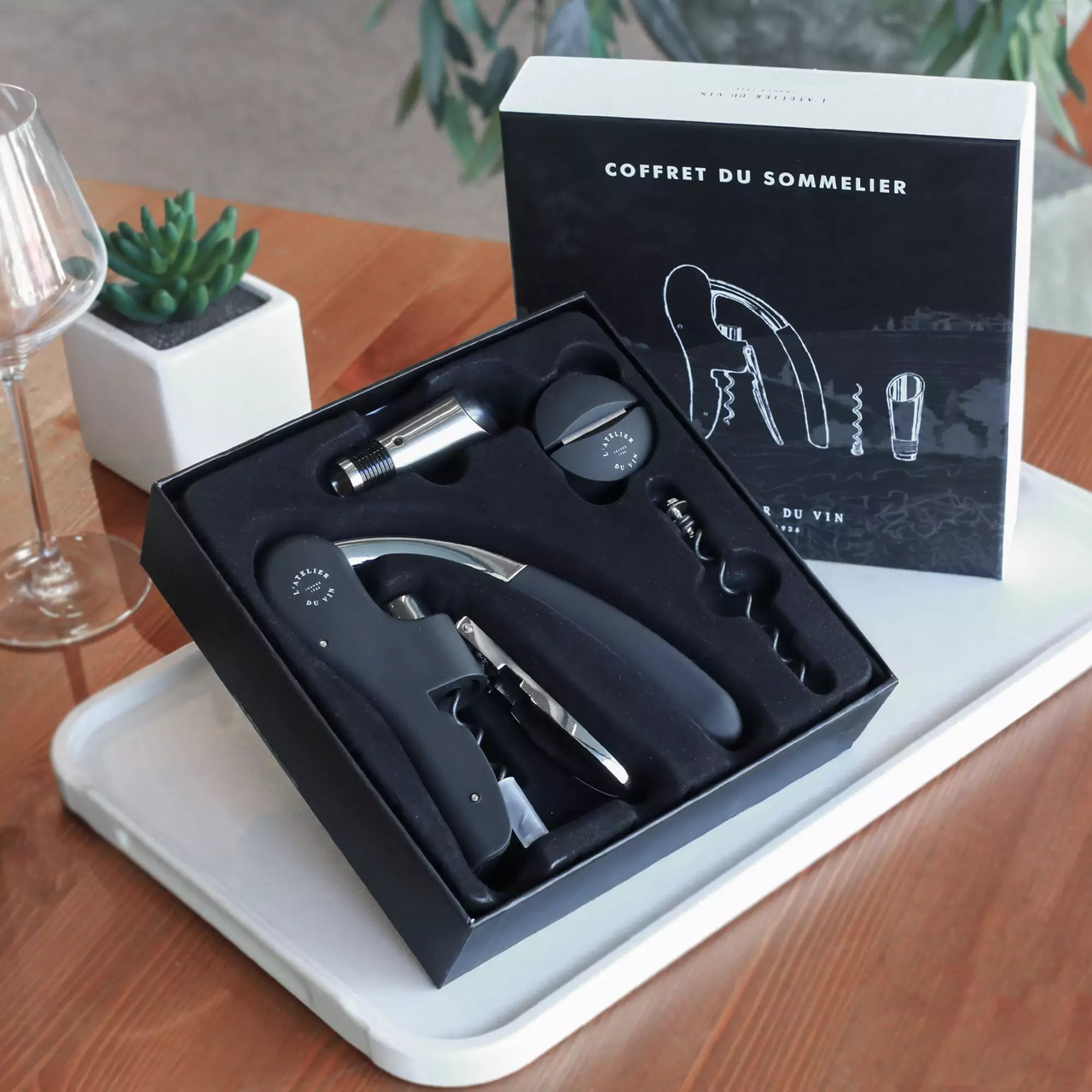 Изготовлен из практичных, современных материалов и отличается долговечностью и простотой ухода. В набор L'Atelier du vin входят пять предметов: штопор, 2 пробки, открывалка. Аксессуары находятся в подарочной коробке из дерева и станут прекрасным приобретением для дома, бара или презентом для ценителя вин. Все аксессуары выполнены из высококачественных материалов, таких как металл, пластик и силикон, что обеспечивает долгов��чность и надежность использования.
