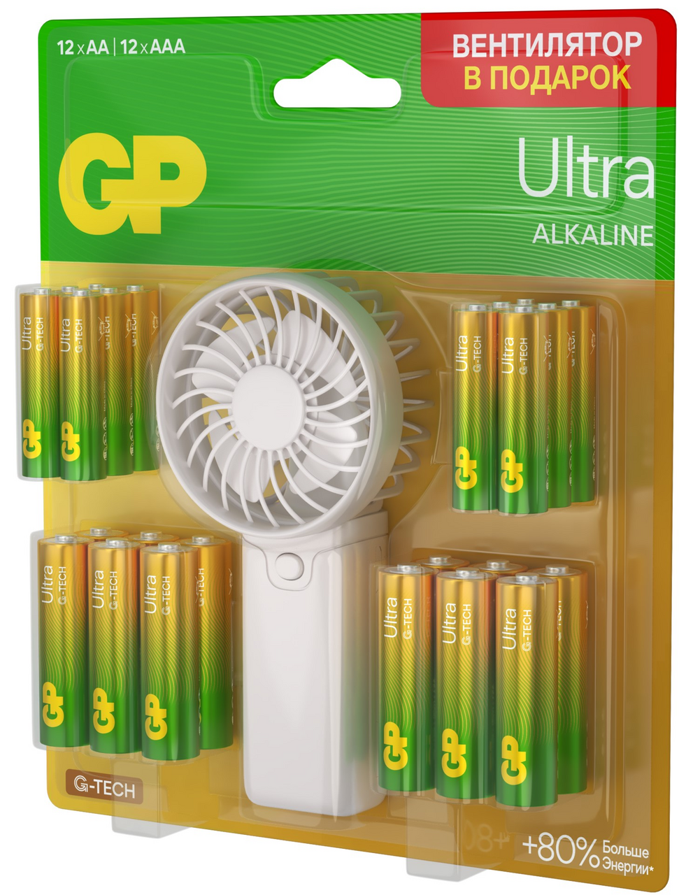 Это промо-набор GP, который состоит из 24 батареек серии Ultra с технологией G-Tech - 12 штук AA и 12 штук AAA, а также портативный вентилятор, работающий на батарейках AA. Это Запас из 24 батареек покрывает потребности большинства домашних и дачных устройств: пульты, игрушки, фонарики, радиоприёмники, садовые гирлянды, электронные весы и многое другое. Такого комплекта хватит на всё лето - особенно удобно иметь его под рукой на даче или в поездке, где нет постоянного доступа к магазинам. Вентилятор из набора - компактный, лёгкий и полностью автономный. Он работает от батареек AA, которые уже есть в комплекте, и пригодится в жаркие дни: в транспорте, на прогулке, в офисе или дома, когда хочется быстро охладиться без необходимости подключаться к розетке. А ещё вентилятор можно использовать нестандартно - например, для розжига углей на мангале, если под рукой нет веера. Или охладить любимую собаку после прогулки. Или быстро остудить чашку кофе, если торопитесь. В общем, возможностей у него не меньше, чем у самих батареек.