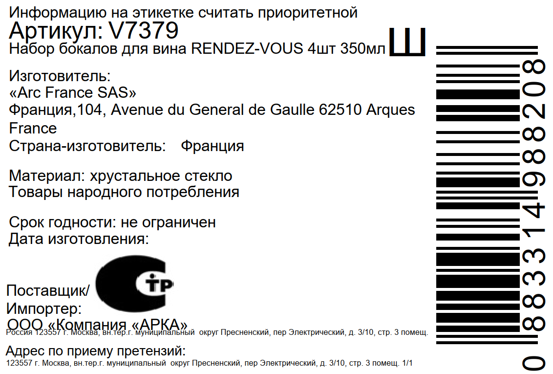 Набор бокалов для вина Cristal d'Arques Rendez-Vous 4шт, 350мл