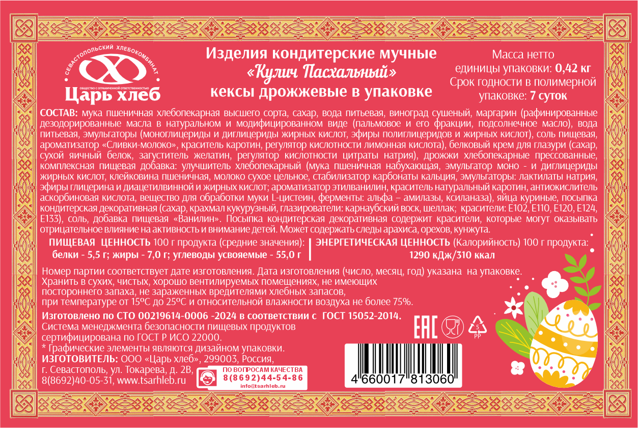 Набор Царь хлеб Пасхальный, 420г приготовлен на основе только натурального сырья высокого качества с большим содержанием сдобы (жиров, сахара, яичных продуктов) — его насыщенность изюмом, апельсиновыми цукатами придает мякишу неповторимый вкус и аромат. Мякиш кулича нежный, тающий во рту и оставляющий великолепное сливочное послевкусие, праздничное настроение и ощущение чего-то необыкновенного.