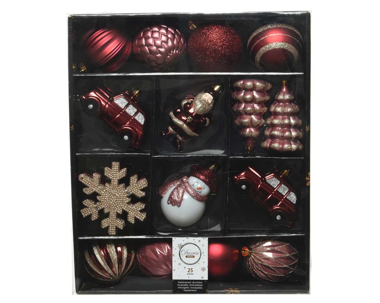 Набор елочных украшений DECORIS, 25 шт. – оригинальные, милые и любимые как детьми, так и взрослыми елочные игрушки. Их используют в качестве дополнения различных элементов новогоднего оформления. В комплект входят снеговик, дед мороз, шары, елки, машинка и снежинки. С их помощью наряжают елку или применяют в качестве декора для хвойных венков, гирлянд, арочных или оконных проемов, композиций для праздничного стола и камина. Игрушки изготовлены из безопасного и экологичного стекла из стекла и при бережном обращении сохраняют презентабельный внешний вид на долгие годы. Комплект можно преподнести как презент коллегам или знакомым или дополнить им основной подарок. Набор станет началом или продолжением коллекции елочных украшений, хранящихся в шкафу в каждом доме.Под брендом DECORIS каждый год выпускаются новые модели и дизайны елочных игрушек с учетом мировых тенденций. Изделия расписывают высококачественными красками, стойкими к потускнению и растрескиванию. Новогодний декор заключен в индивидуальную коробку, в которой игрушки удобно транспортировать или хранить после каждого новогоднего праздника. Приобрести набор елочных украшений DECORIS, 25 шт. можно в торговом центре METRO.