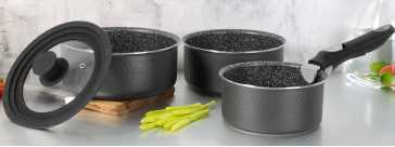 Керамическое антипригарное покрытие - натуральные материалы: камень и песок.Набор посуды для индукционной плиты и других видов плит.Можно использовать в духовом шкафу, как форма для запекания и выпекания.Отсутствие токсичных выделений в процессе приготовления пищи.Утолщенное дно из литого безопасного алюминия для идеальной теплопроводности.Экономия электроэнергии и времени приготовления.Можно готовить с минимальным количеством масла.
