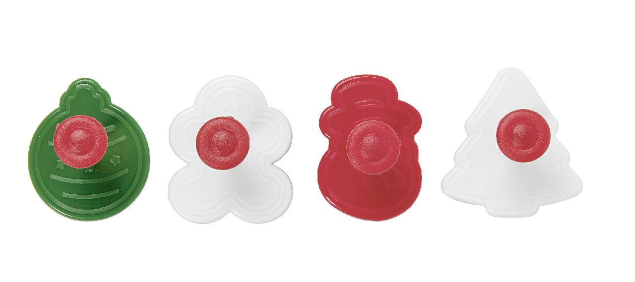 Форма для вырезания печений "Рождество" со штампом понравятся тем, кто любит печь вместе с детьми. С помощью этих формочек вы создадите забавные фигурки из теста: у вас получится дружная новогодняя компания – елочка, новогодний шар, снеговик и человечек. Сначала вырежьте фигурку из теста, затем переверните формочку и слегка надавите на фигурку, на ней появится рельеф. Вы также можете украсить печенья по вашему желанию мастикой, цукатами, цветной кондитерской посыпкой или глазурью. Фантазируйте вместе с детьми, и они подскажут вам огромное количество интересных идей. Формочки изготовлены из пищевого пластика, легко моются, не занимают много места при хранении.