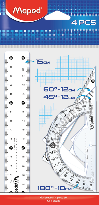 Набор геометрический Maped Start Mini линейки идеально подойдет как для ребенка, так и для взрослого человека. Он состоит из 4 предметов, каждый из которых выполняет определенные функции. Линейка – это простой измерительный инструмент, который можно применять на уроках геометрии и для черчения. Он представля��т собой тонкую длинную пластину, на которую нанесена шкала с различными отметками в миллиметрах и сантиметрах. Транспортир помогает строить и измерять углы. Он состоит из линейки и полукруга, разделенного на градусы от 0 до 180. Угольник – это инструмент для построения углов. Он представляет собой прямоугольный треугольник с острыми углами 60 и 45.