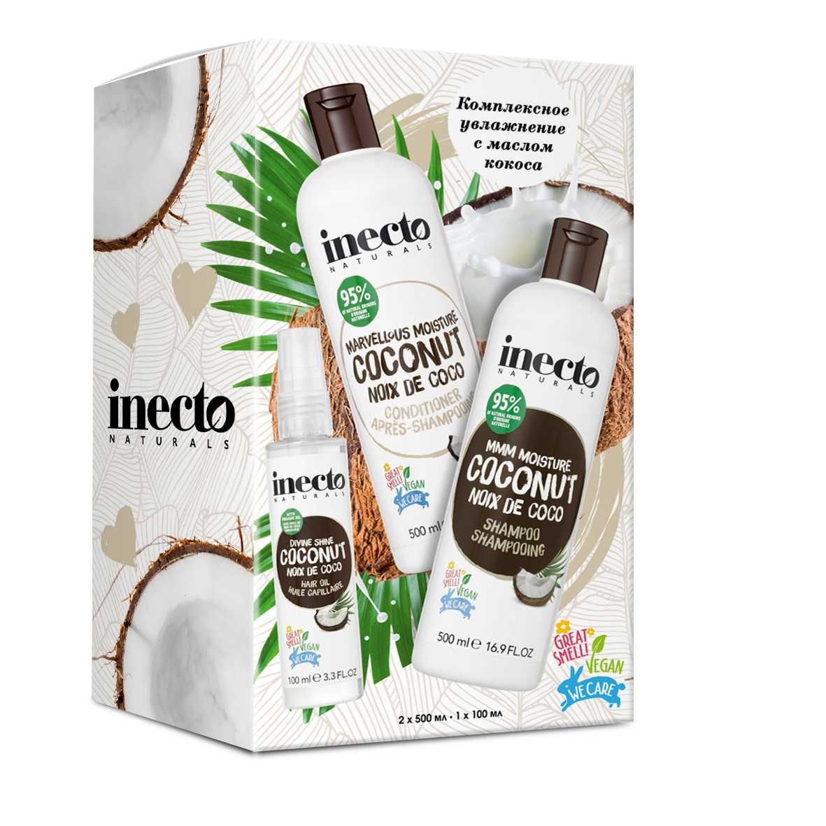Подарочный набор Inecto Naturals Coconut шампунь увлажняющий 500мл + кондиционер увлажняющий 500мл + масло для волос 100мл