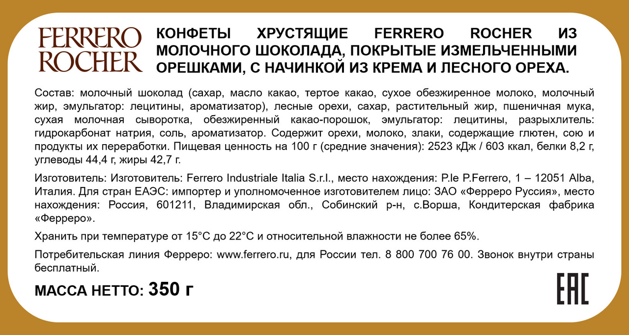 Конфеты Ferrero Rocher – праздник безупречного орехово-шоколадного вкуса. Ядра цельного фундука в нежной оболочке воздушного крема и изысканного молочного шоколада, помещены в тонкую хрустящую вафельную сферу и обсыпаны крошкой из измельченного ореха. Этот вкус просто невозможно переоценить или забыть. В прозрачной подарочной упаковке каждая конфетка смотрится как настоящая драгоценность. Коробка будет прекрасным подарком или вкусным сюрпризом для всей семьи. Она также может стать вкусным украшением романтического ужина.