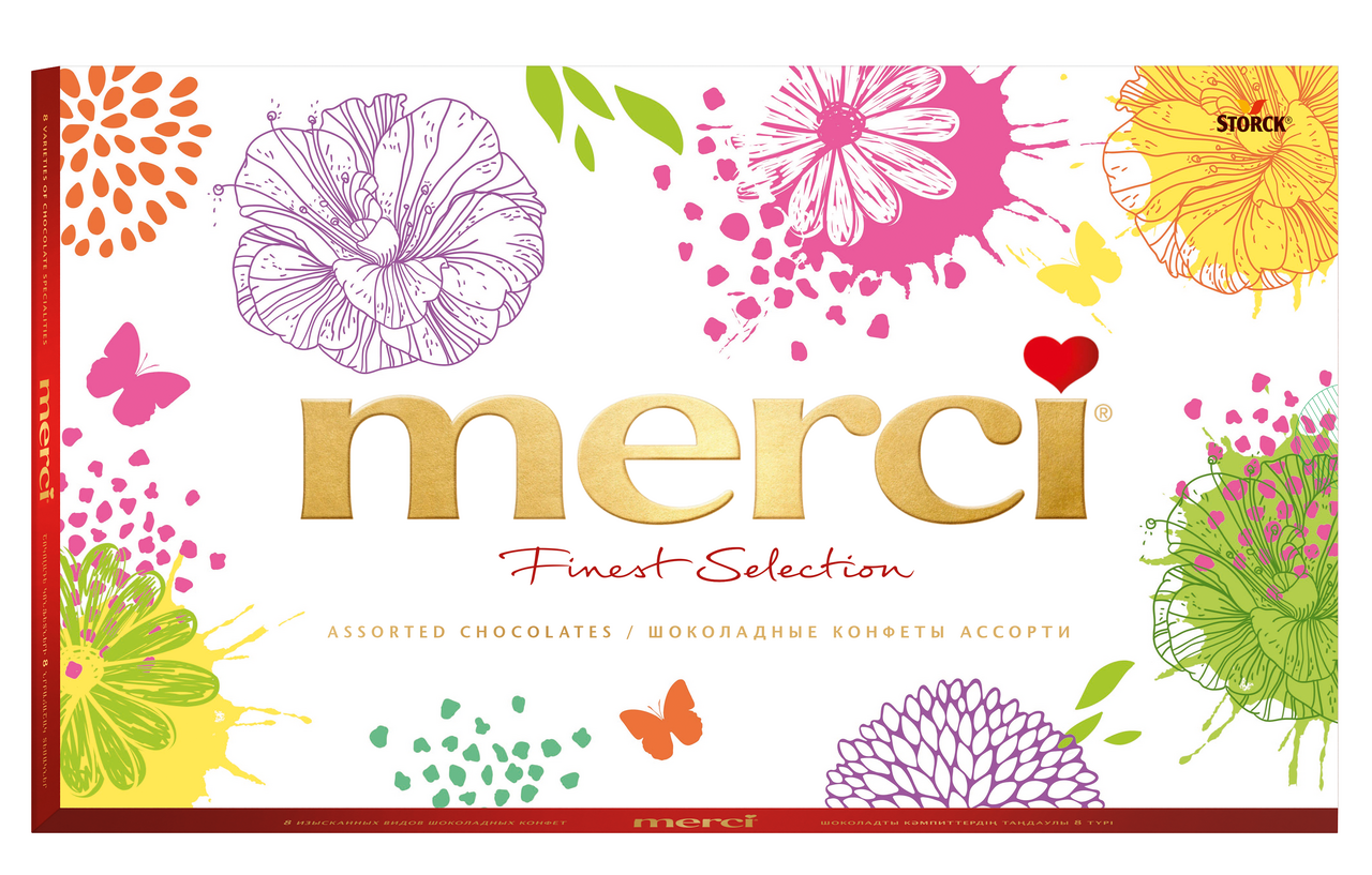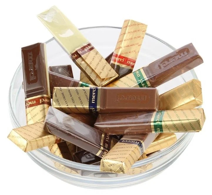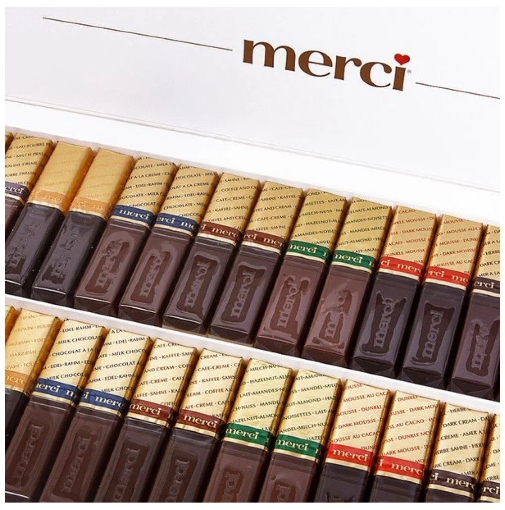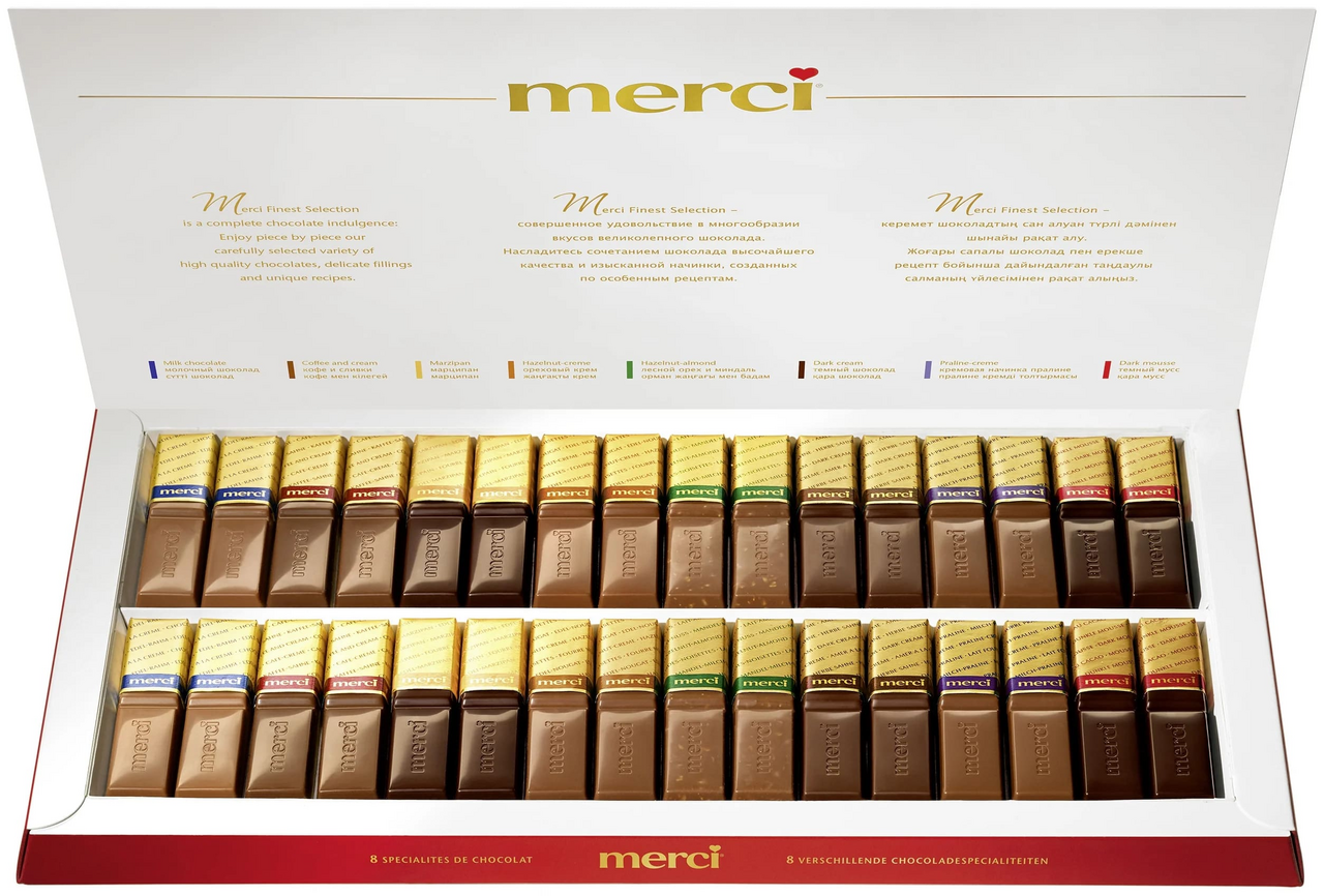 Это великолепное ассорти из коллекции изысканного европейского шоколада, для производства которого используются ингредиенты высокого качества. Шоколадные конфеты Merci ассорти включают в себя 8 изысканных видов шоколадных конфет: ореховый крем; молочный шоколад; лесной орех и миндаль; кремовая начинка пралине; темный шоколад; марципан; темный мусс; кофе и сливки. Это изысканное лакомство из Германии, приготовленное из высококачественных ингредиентов. Каждая конфета находится в индивидуальной упаковке из золотой фольги и прозрачной пленки, через которую виден фирменный оттиск Merci.