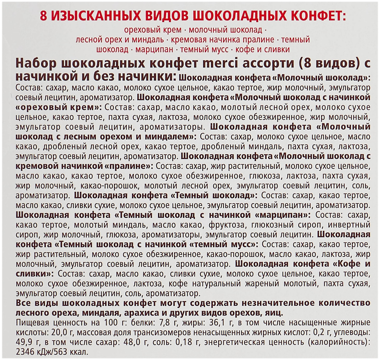Конфеты шоколадные Молочный шоколад: сахар, масло какао, молоко сухое цельное, какао тертое, жир молочный, эмульгатор соевый лецитин, ароматизатор. Конфеты шоколадные Молочный шоколад с начинкой ореховый крем: сахар, масло какао, молотый лесной орех, молоко сухое цельное, какао тертое, пахта сухая, лактоза, молоко сухое обезжиренное, жир молочный, эмульгатор соевый лецитин, ароматизаторы. Конфеты шоколадные Молочный шоколад с лесным орехом и миндалем: сахар, молоко сухое цельное, масло какао, дробленый лесной орех, какао тертое, дробленый миндаль, пахта сухая, лактоза, эмульгатор соевый лецитин, ароматизатор. Конфеты шоколадные Молочный шоколад с кремовой начинкой пралине: сахар, жир растительный, молоко сухое цельное, масло какао, какао тертое, молоко сухое обезжиренное, глюкоза, лактоза, пахта сухая, жир молочный, какао-порошок, молотый лесной орех, эмульгатор соевый лецитин, соль, ароматизатор. Конфеты шоколадные Темный шоколад: сахар, какао тертое, масло какао, сливки сухие, молоко сухое цельное, эмульгатор соевый лецитин, ароматизатор. Конфеты шоколадные Темный шоколад с начинкой марципан: сахар, какао тертое, молотый миндаль, масло какао, фруктоза, глюкозный сироп, инвертный сироп, жир молочный, глюкоза, ароматизаторы, эмульгатор соевый лецитин. Конфеты шоколадные Темный шоколад с начинкой темный мусс: сахар, какао тертое, жир растительный, молоко сухое обезжиренное, какао-порошок, масло какао, лактоза, жир молочный, эмульгатор соевый лецитин, ароматизатор. Конфеты шоколадные Кофе и сливки: сахар, масло какао, сливки сухие, молоко сухое цельное, какао тертое, молоко сухое обезжиренное, лактоза, кофе натуральный жареный молотый, пахта сухая, эмульгатор соевый лецитин, соль, ароматизатор.