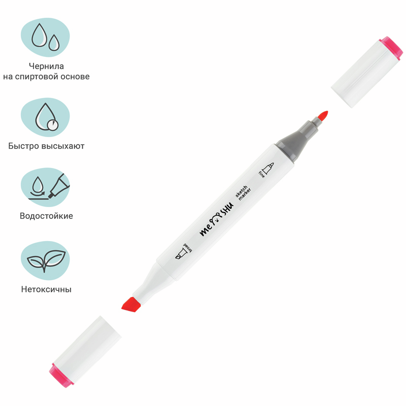 Чернила на спиртовой основе. Надписи, сделанные маркером, быстро высыхают. Можно использовать для рисования по бумаге любого типа. Для достижения наилучшего результата рекомендуется использовать специализированную бумагу для маркеров на спиртовой основе. Идеальный инструмент для иллюстраторов, студентов и всех, увлекающихся творчеством.