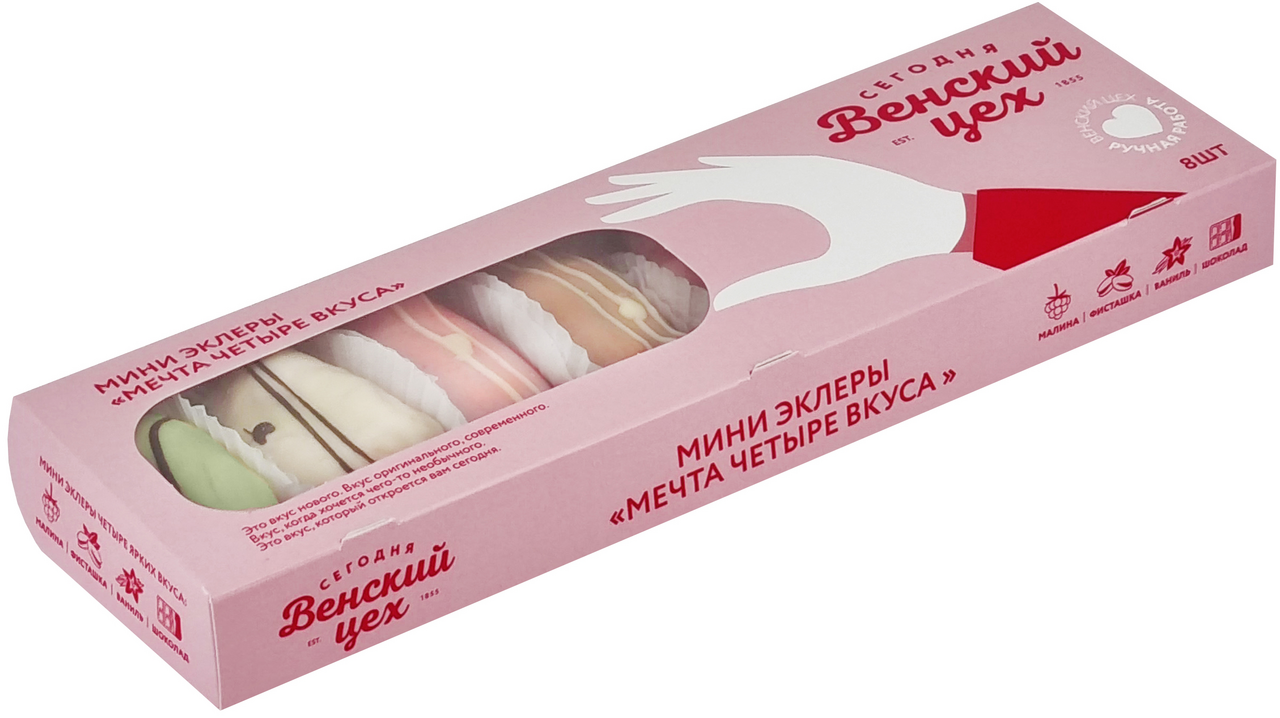 Пирожное ВЕНСКИЙ ЦЕХ Мечта набор, 200 г придется по вкусу всем любителям сладкого независимо от возраста. Набор состоит из 8 заварных пирожных, каждое из которых лежит на отдельной бумажной формочке. Тонкое тесто наполнено нежным сладким кремом, а сверху покрыто разноцветной глазурью с разными вкусами: ванильным, шоколадным, фисташковым и малиновым (по два пирожных с каждым вкусом). Такой десерт станет хорошим дополнением к чаепитию. Красивая упаковка делает его отличным подарочным вариантом. Приобрести пирожное ВЕНСКИЙ ЦЕХ Мечта набор, 200 г вы всегда сможете в торговом центре METRO.Производитель: ООО Венский цех, Россия, г. Москва, Ленинградский пр-т, 15с3.Состав: глазурь белая (сахар-песок, растительный жир, молоко сухое цельное, сыворотка молочная сухая, эмульгатор - лецитины, идентичные натуральным ароматизаторы), молоко цельное сгущенное с сахаром ГОСТ (молоко нормализованное, сахар-песок), масло сливочное 82,5%, яичный меланж, мука пшеничная, молоко питьевое, глазурь кондитерская, начинка малиновая, паста фисташковая, коньяк, соль поваренная пищевая, консервант - кислота сорбиновая, идентичный натуральному ароматизатор, пищевые красители натуральные.Пищевая ценность: белки – 5,5 г, жиры – 33 г, углеводы – 44 г.Энергетическая ценность: 490 ккал.Срок годности: 120 часов.Условия хранения: хранить при температуре от 2C до 6C.