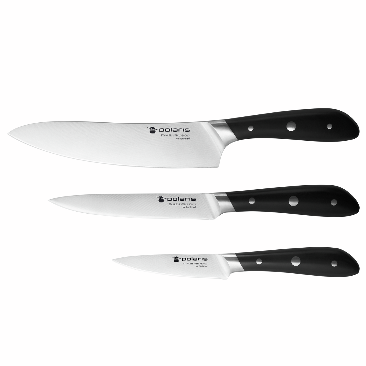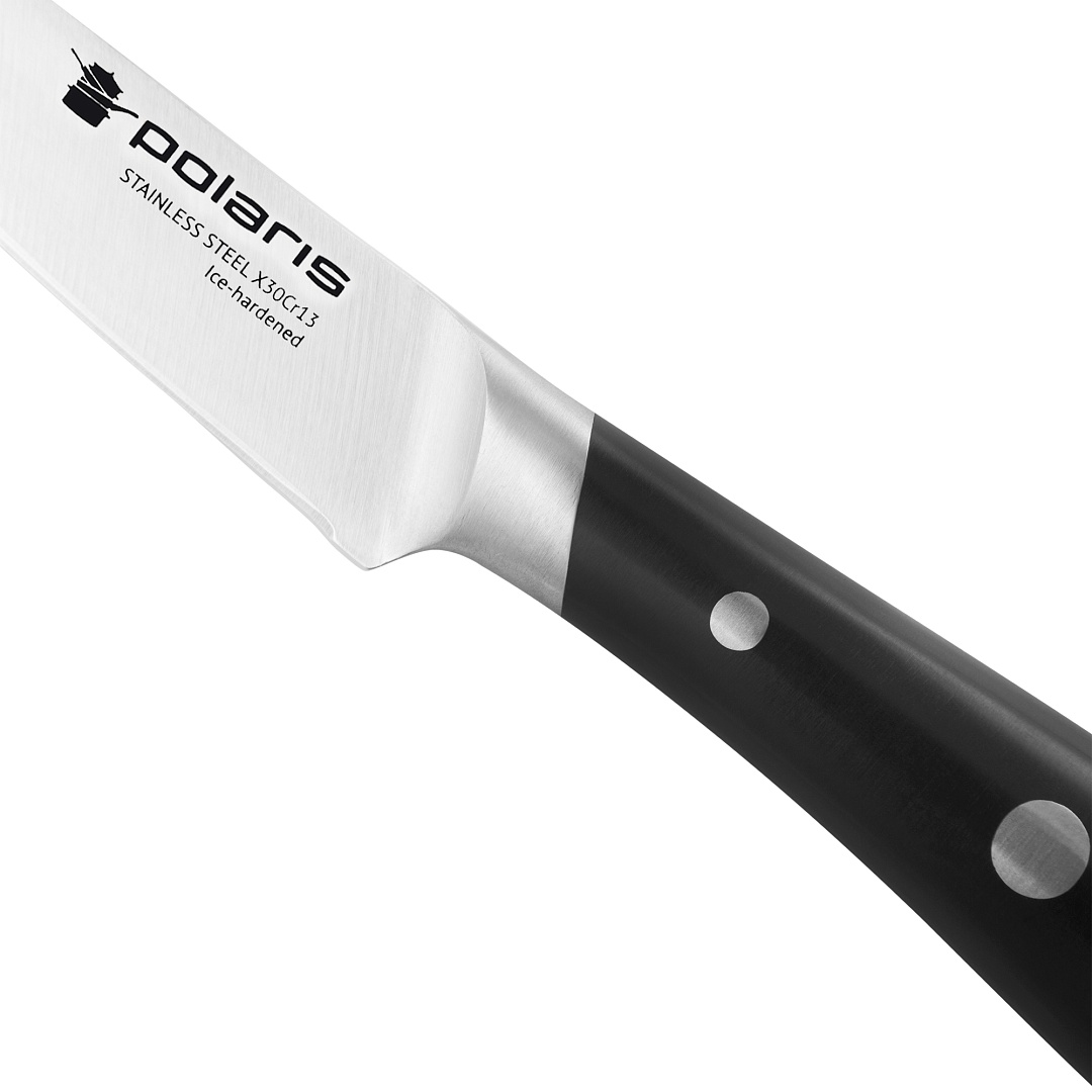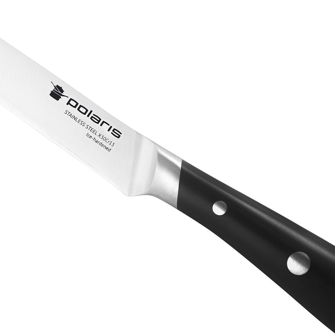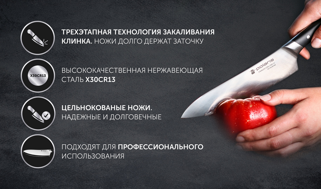 Двусторонняя заточка лезвий.Материал клинка - нержавеющая сталь X30Cr13.Материал рукоятки - ABS пластик.ICE HARDENING technology - уникальная трехэтапная технология закаливания ножей, обеспечивающая особую прочность.Ножи долго держат заточку.Твердость по шкале Роквелла 54 2HRC.Высокая сопротивляемость деформации.Эргономичная форма рукоятки обеспечивает удобный захват инструмента и безопасность при работе.Жесткое трехклепочное крепление обеспечивает долговечность.Цельнокованый нож отвечает самым высоким санитарным требованиям.Можно мыть в посудомоечной машине.2 года гарантии.
