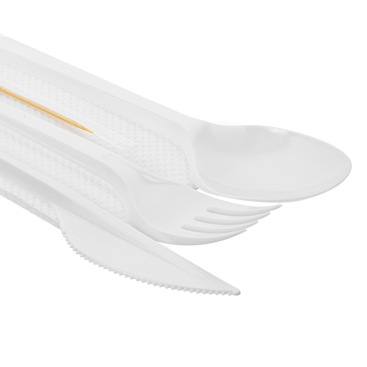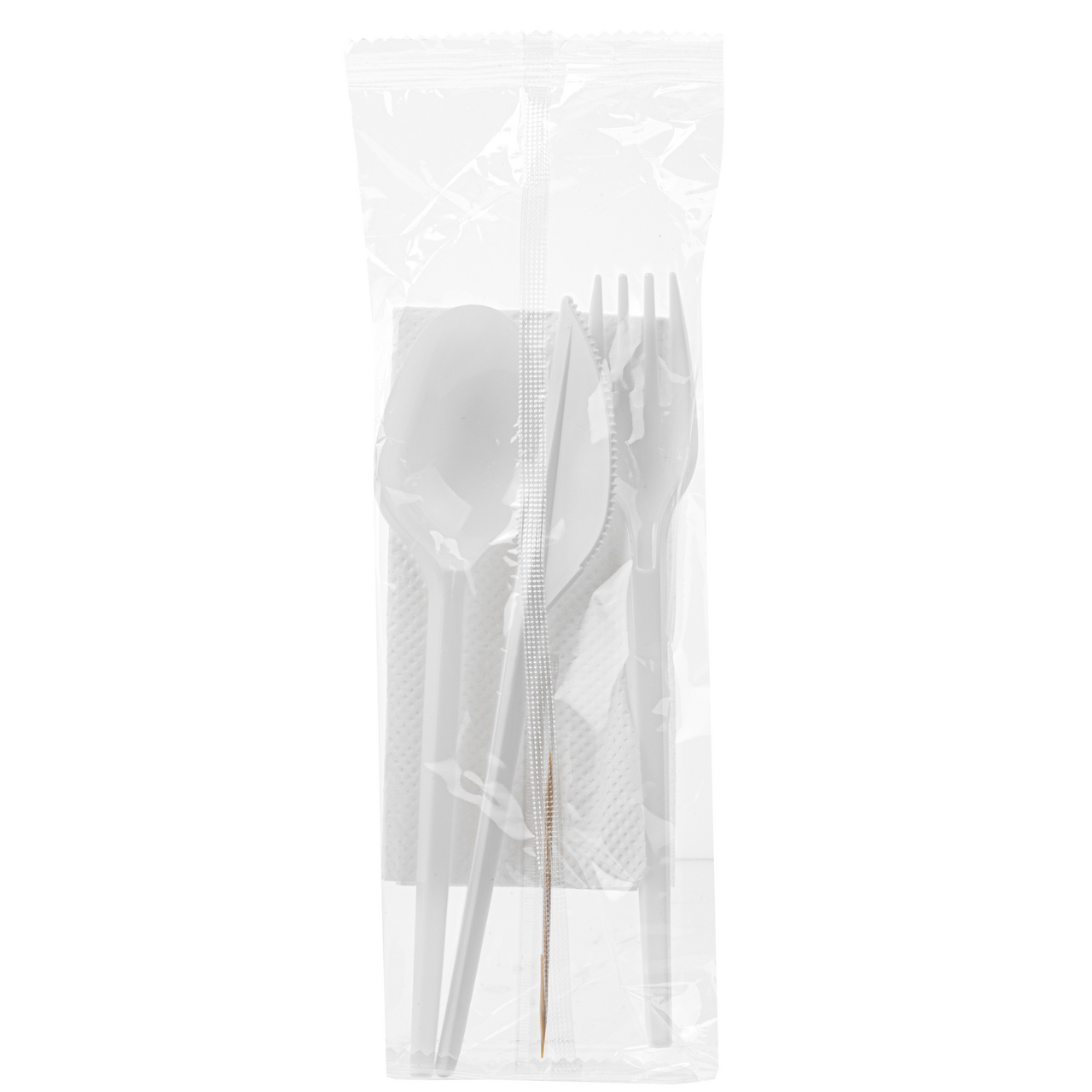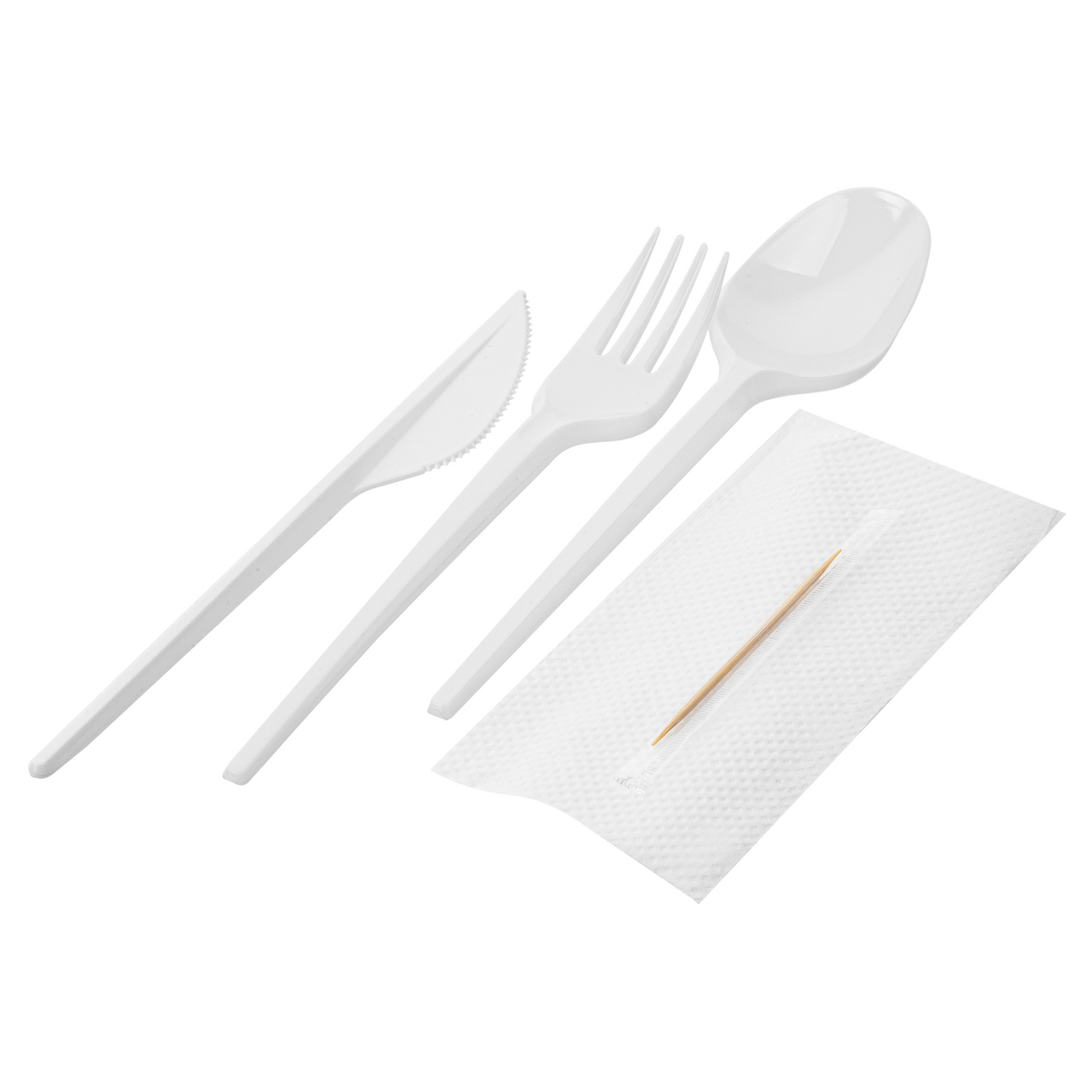 Набор столовых приборов состоит из: - Вилка столовая белая - 1 шт; - Ложка столовая белая - 1 шт; - Нож столовый белый - 1 шт; - Зубочистка в индивидуальной упаковке - 1 шт; - Салфетка одноразовая - 1 шт. Столовые приборы предназначены для употребления как охлажденных, так и горячих пищевых продуктов. Набор столовых приборов соответствует всем качественным стандартам.