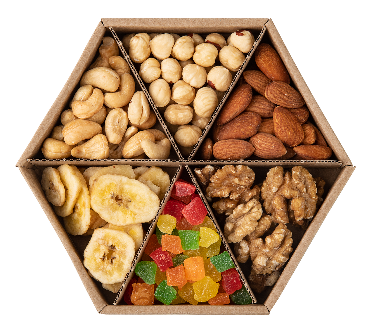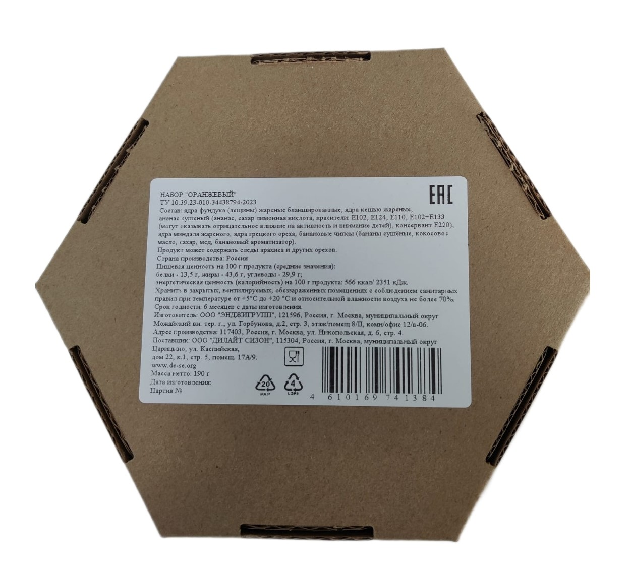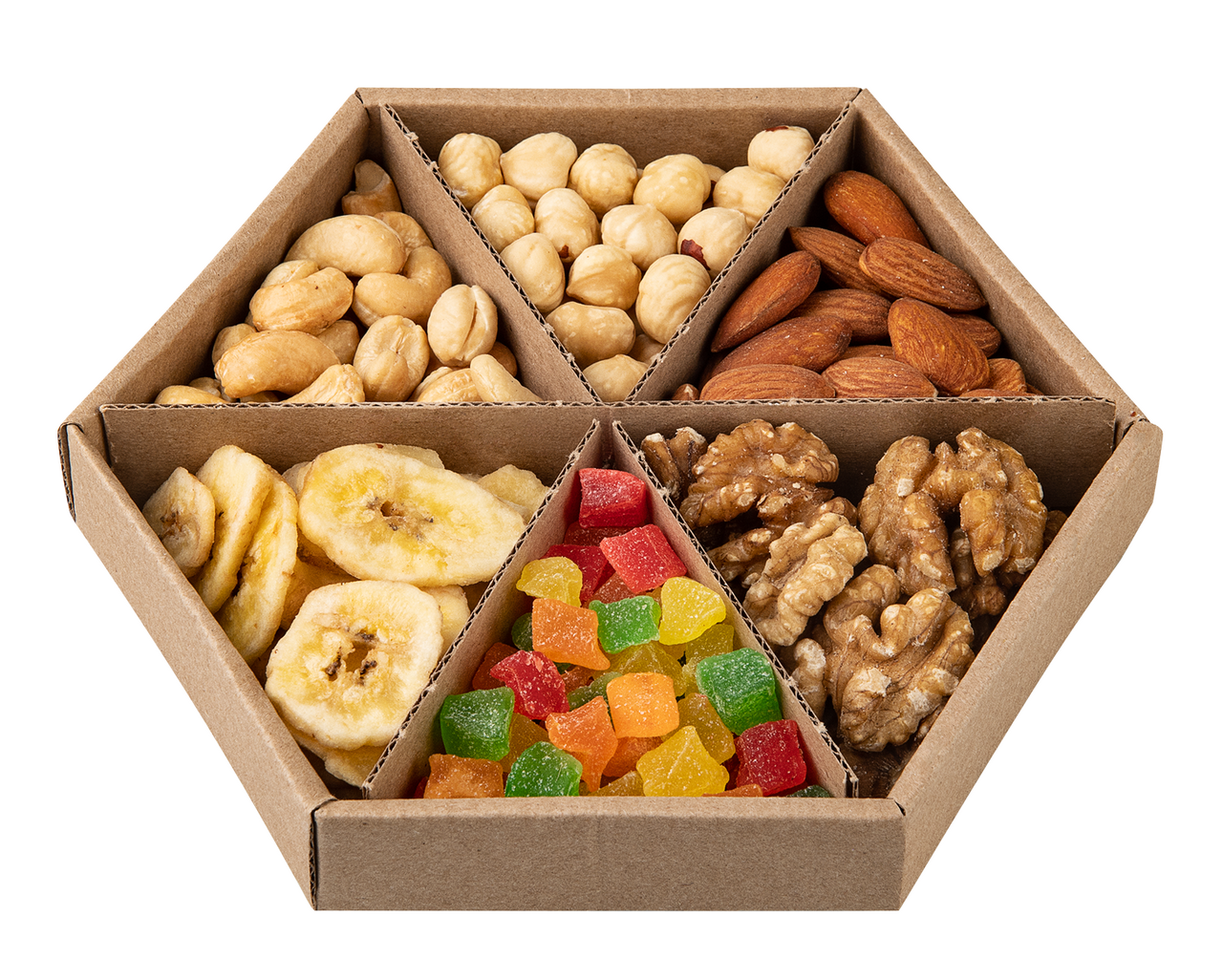 Ядра фундука лещины жареные бланшированные, ядра кешью жареные, ананас сушёный ананас, сахар лимонная кислота, красители: Е102, Е124, Е110, Е102+Е133 могут оказывать отрицательное влияние на активность и внимание детей, консервант Е220, ядра миндаля жареного, ядра грецкого ореха, банановые чипсы бананы сушёные, кокосовое масло, сахар, мёд, банановый ароматизатор.