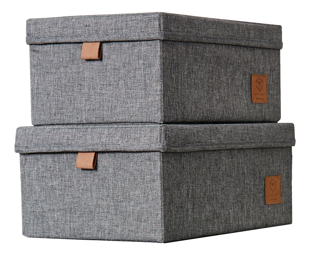 Многофункциональные коробки-футляры для хранения с крышкой. Имеют твердые стенки и дно. В наборе 2 штуки коробок разных размеров для удобства хранения разногабаритных вещей. Материал: внешняя ткань: 100% лен. Внутренняя ткань: 100% полиэстер, МДФ, картон.