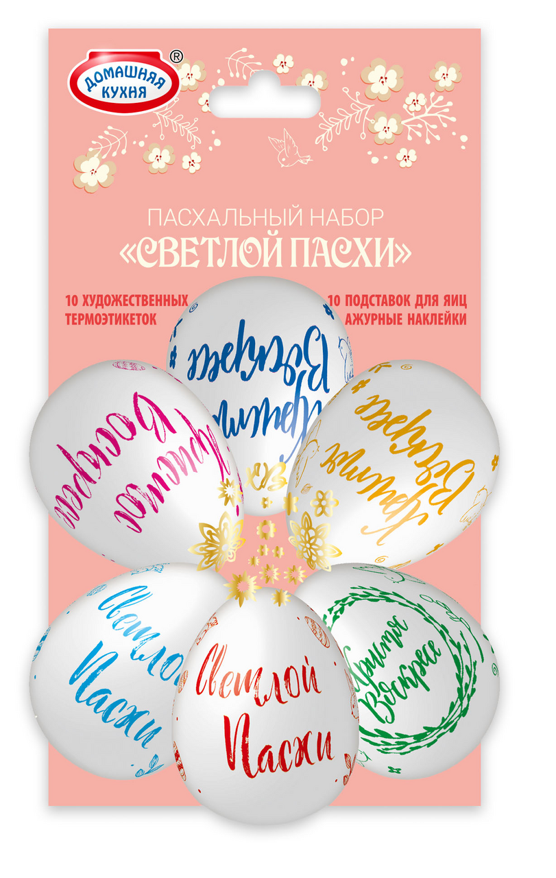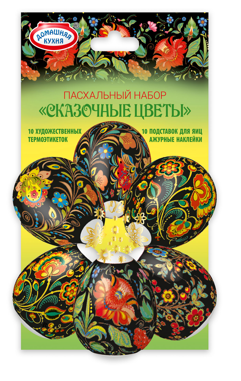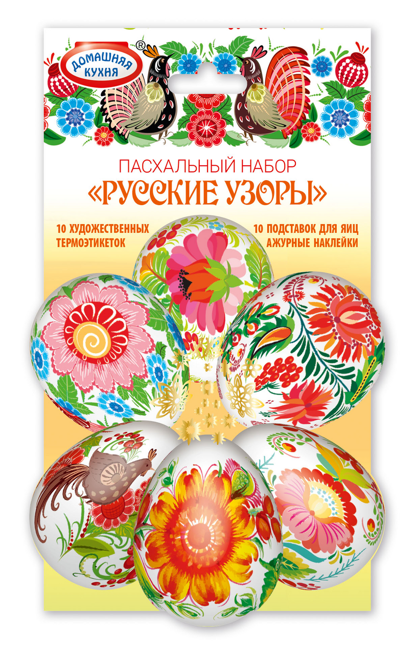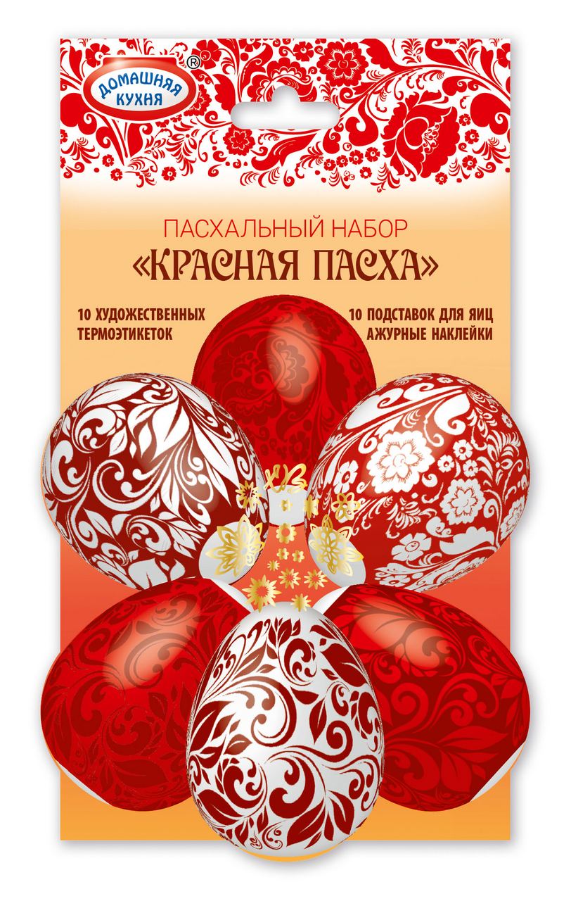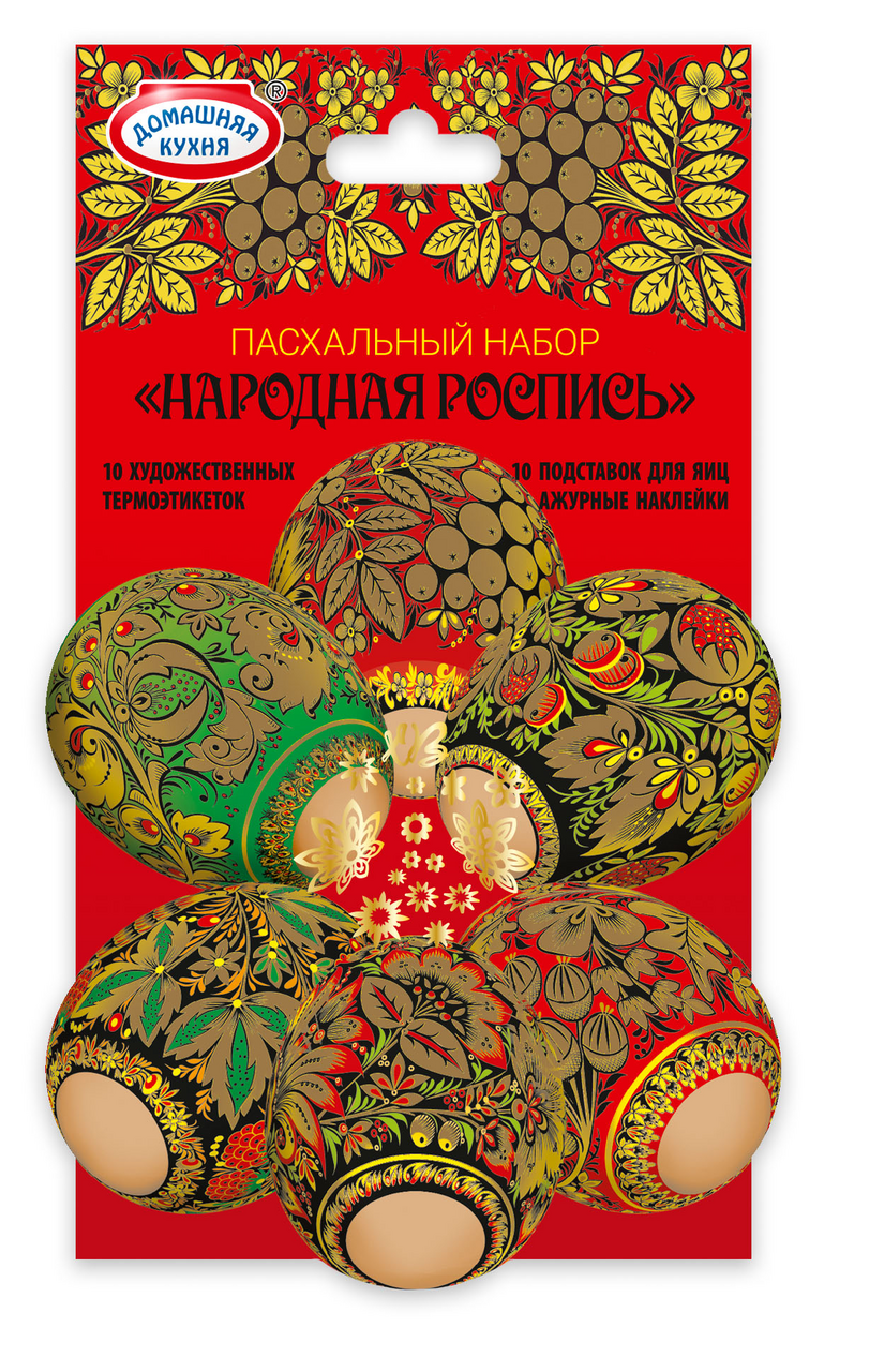 Набор пасхальный Домашняя кухня народный промысел представляет собой набор ярких интересных термоэтикеток и подставок, которые предназначены для пасхальных яиц. Ими можно украсить как уже окрашенные, так и только что сваренные куриные яйца. Они изготовлены из материала, безопасного для здоровья. Изделия необходимо хранить в сухом прохладном месте – так они дольше сохранят свои качества. Продукт помещен в упаковку, которая позволяет оценить качество товара еще на стадии покупки. Способ применения пленок очень просто: нужно надеть их на остывшее яйцо, а затем на несколько секунд опустить в кипящую воду.