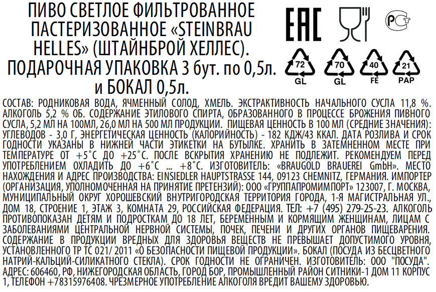 Пивной набор Steinbrau Helles светлое + бокал, 0.5л x 3 шт