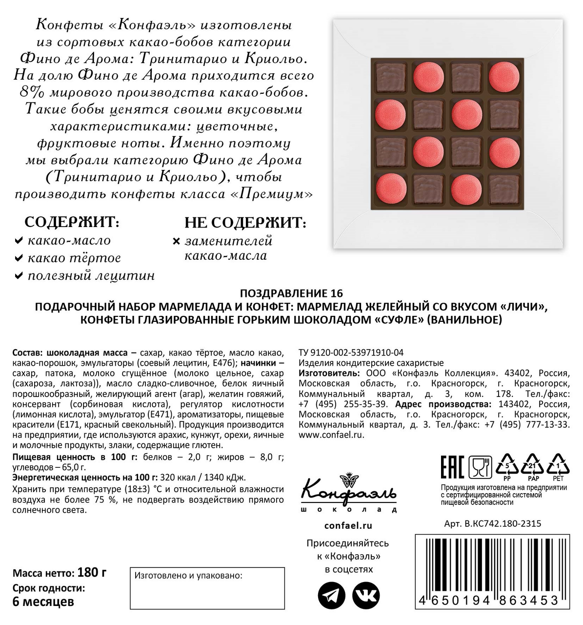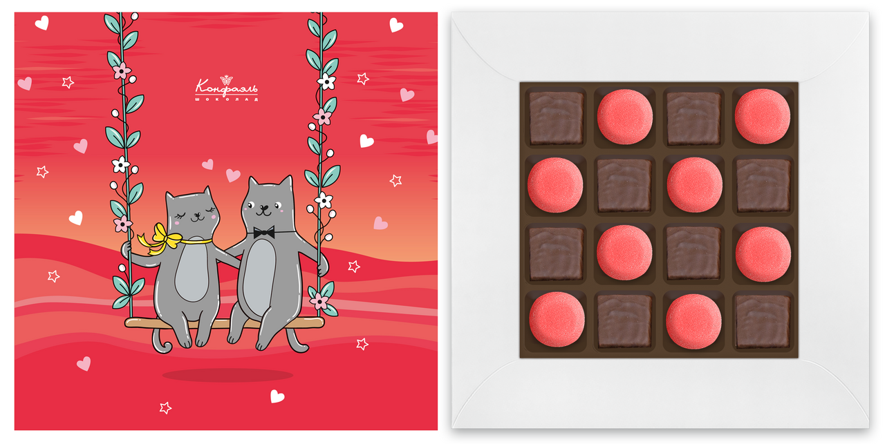 Милая коробка конфет скрывает в себе удивительный вкус настоящего шоколада c нежнейшим суфле и мармеладом со вкусом личи , такой подарок станет приятным сюрпризом или сделает будний день ярче.