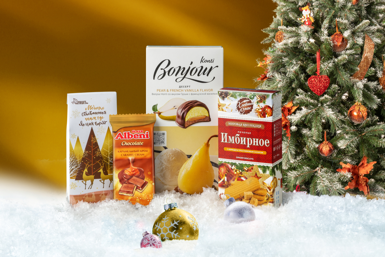 Печенье сдобное хлебный спа имбирное с корицей и тростниковым сахаром 240г; десерт Bonjour Konti со вкусом груша с французской ванилью 232г; чай черный байховый крупнолистовой 50г; молочный шоколад с печеньем и кремом со вкусом карамели Albeni chocolate торговой марки Ulker 85г