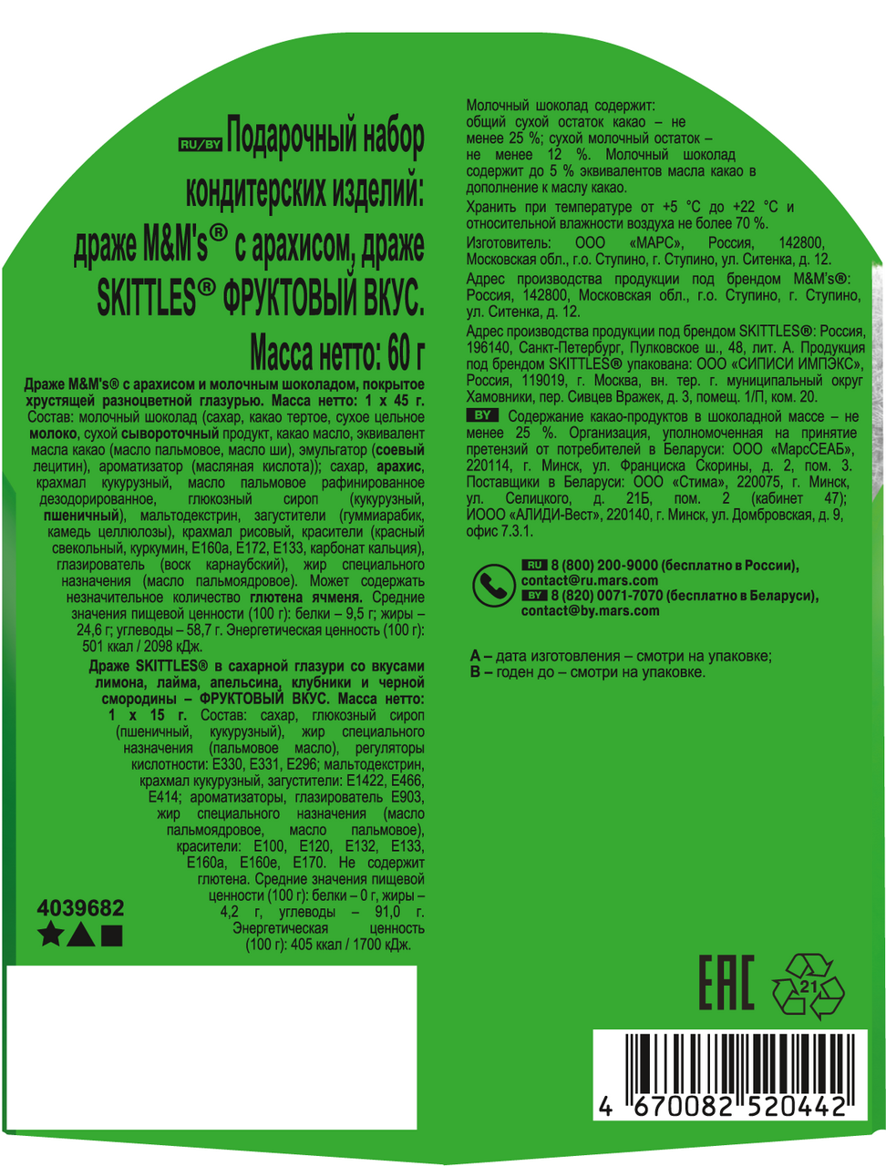 Подарочный набор M&M’s & Friends на Новый Год - это новогоднее украшение на елку, которые порадуют близких и создадут праздничное настроение. В наборе представлены любимые бренды - M&M's и Skittles. - Оригинальная упаковка, выполненная в форме елочной игрушки, которой можно украсить новогоднюю елку;- Удобный формат индивидуального подарка, который добавит волшебства в праздничную ночь;- Набор представлен в трех дизайнах.