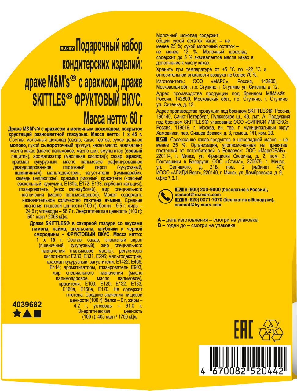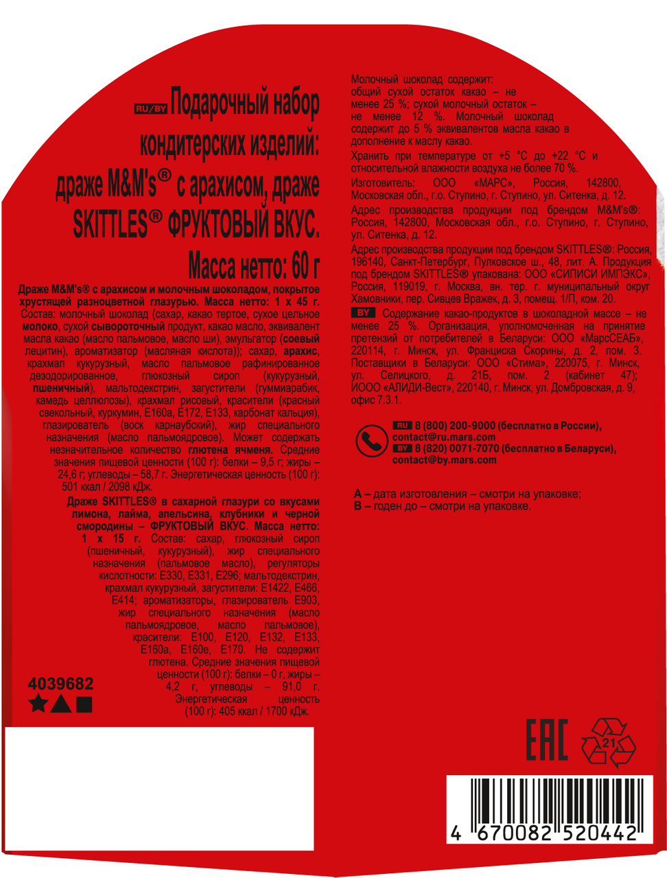Молочный шоколад сахар, какао тёртое, сухое цельное молоко, сухой сывороточный пермеат из молочного сырья, какао масло, эквивалент масла какао масло пальмовое, масло ши, эмульгатор соевый лецитин, ароматизатор масляная кислота; сахар, арахис, крахмал кукурузный, масло пальмовое рафинированное дезодорированное, глюкозный сироп кукурузный, пшеничный, мальтодекстрин, загуститель гуммиарабик, крахмал рисовый, красители красный свекольный, куркумин, каротины, Е172, Е133, карбонат кальция, глазирователь воск карнаубский, жир специального назначения масло пальмоядровое; сахар, глюкозный сироп пшеничный, кукурузный, жир специального назначения пальмовое масло, регуляторы кислотности: Е330, Е296; загустители: Е1400, Е1422; ароматизаторы, регулятор кислотности Е331, глазирователь Е903, жир специального назначения, красители: Е120, Е170, Е100, Е132, Е160а, Е133, Е160е.
