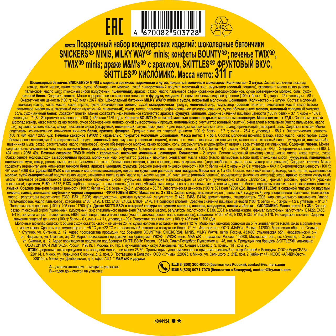 Молочный шоколад сахар, какао тёртое, сухое цельное молоко, сухой сывороточный пермеат из молочного сырья, какао масло, эквивалент масла какао масло пальмовое, масло ши, эмульгатор соевый лецитин, ароматизатор масляная кислота; сахар, арахис, крахмал кукурузный, масло пальмовое рафинированное дезодорированное, глюкозный сироп кукурузный, пшеничный, мальтодекстрин, загуститель гуммиарабик, крахмал рисовый, красители красный свекольный, куркумин, каротины, Е172, Е133, карбонат кальция, глазирователь воск карнаубский, жир специального назначения масло пальмоядровое; сахар, глюкозный сироп пшеничный, кукурузный, жир специального назначения пальмовое масло, регуляторы кислотности: Е330, Е296; загустители: Е1400, Е1422; ароматизаторы, регулятор кислотности Е331, глазирователь Е903, жир специального назначения, красители: Е120, Е170, Е100, Е132, Е160а, Е133, Е160е.