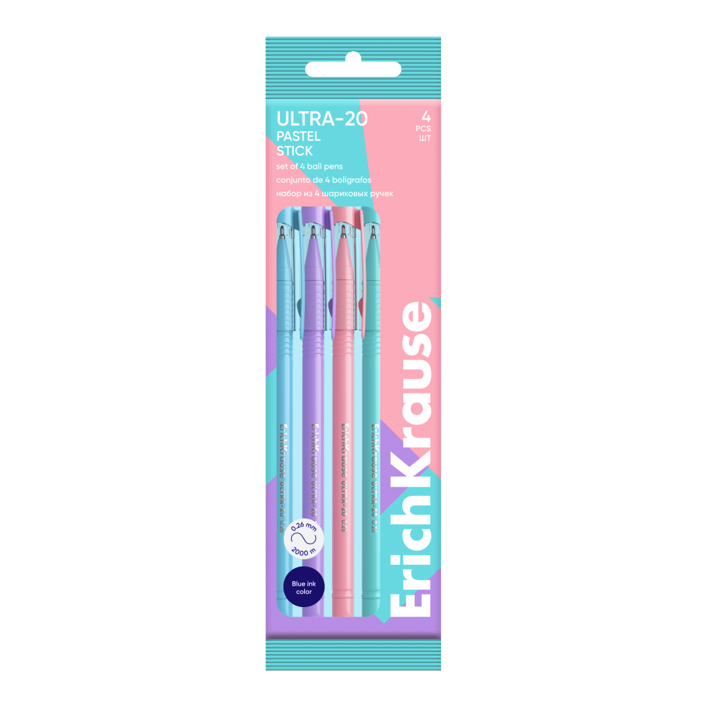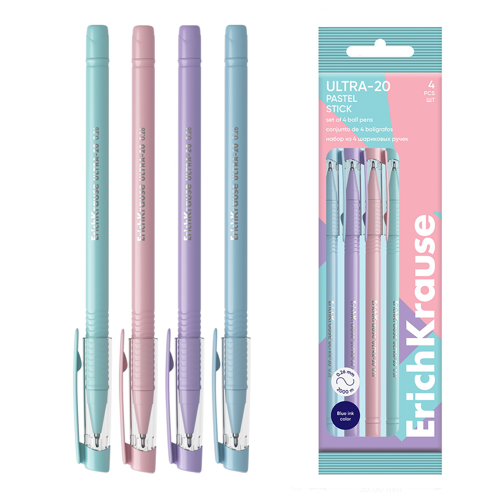 Набор шариковых ручек Erich Krause ULTRA-20 Stick Pastel цвет чернил синий, 4шт