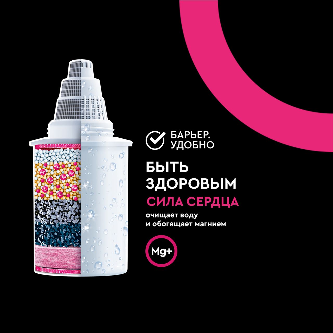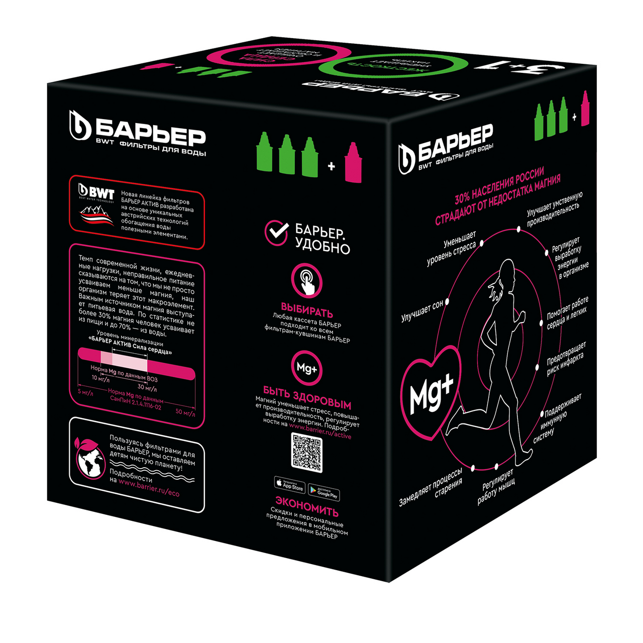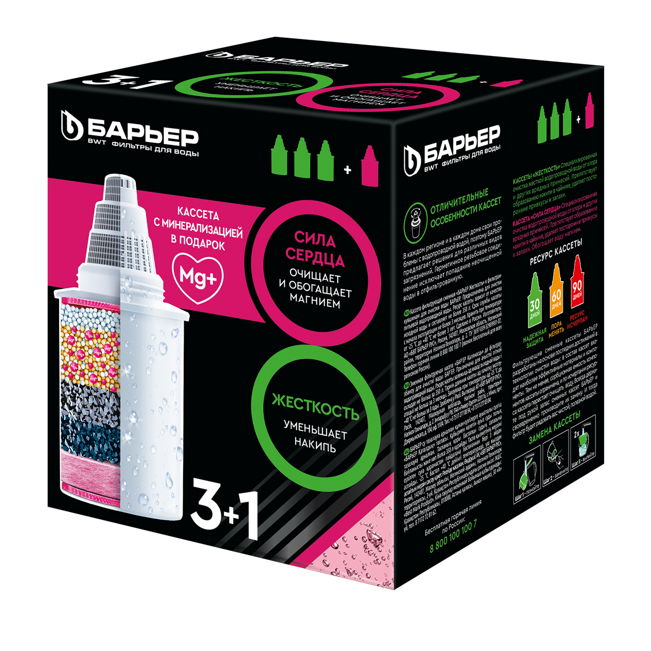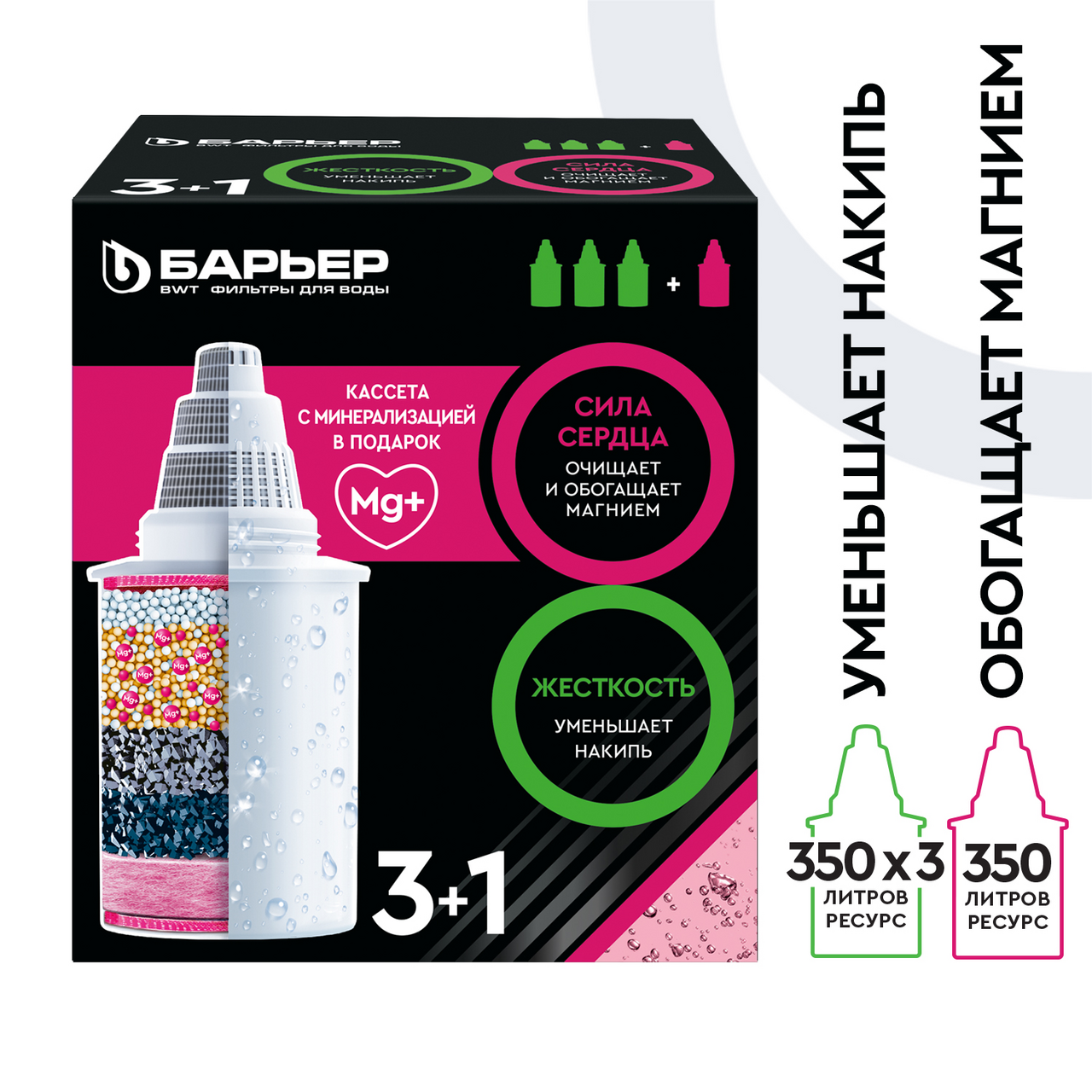 Барьер Жесткость Убирает излишнюю жесткость воды, препятствуя образованию накипи. Удаляют хлор и ионы тяжелых металлов.В комплект входит сменная кассета АКТИВ Сила сердца.