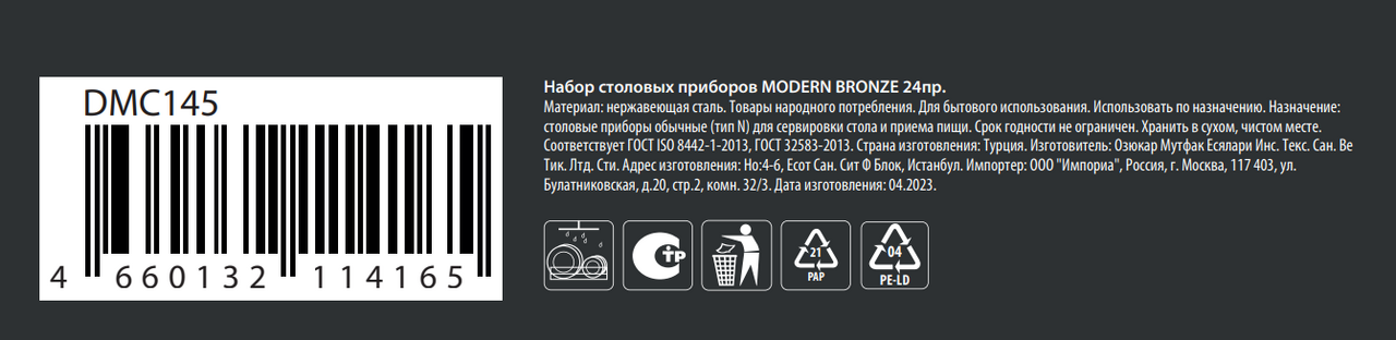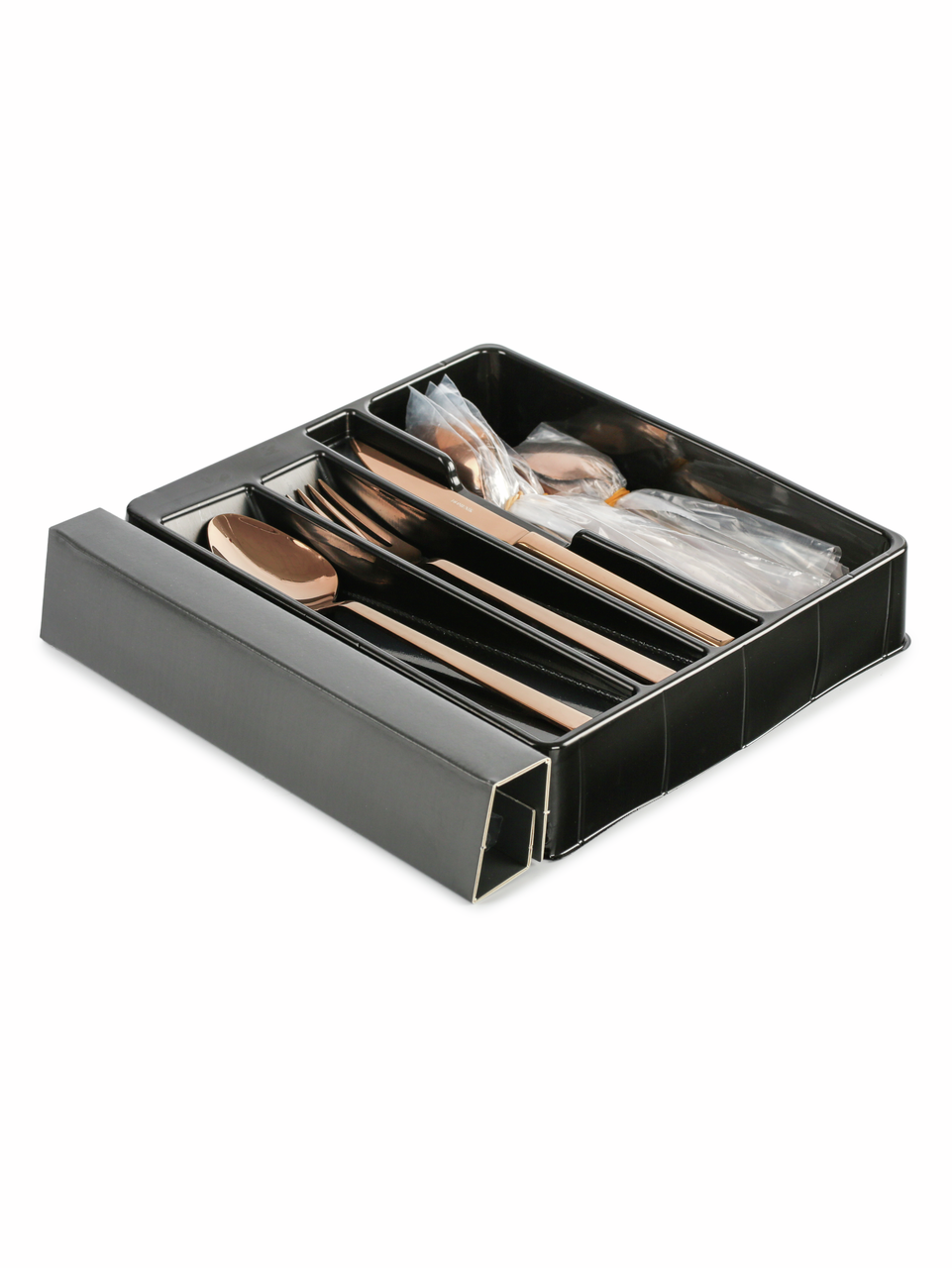В наборе столовых приборов на 6 персон - 24 предмета - 6 столовых ножей, 6 столовых вилок, 6 столовых ложек, 6 чайных ложек. Набор столовых предметов выполнен из высококачественной нержавеющей стали 18/10, очень прочные, не гнутся, имеют длительный срок службы, отлично сохраняют эксплуатационные свойства. Пищевая нержавеющая сталь не имеет запаха и сохраняет вкус и аромат продуктов натуральными. Стильные золотые вилки, ложки, ножи идеально впишутся в интерьер кухни, оформленной в современном стиле. Можно мыть в посудомоечной машине.