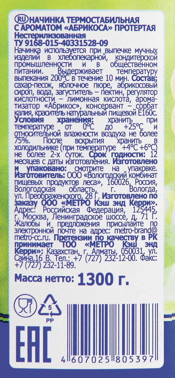 METRO Chef Начинка для выпечки Абрикос, 1.3кг