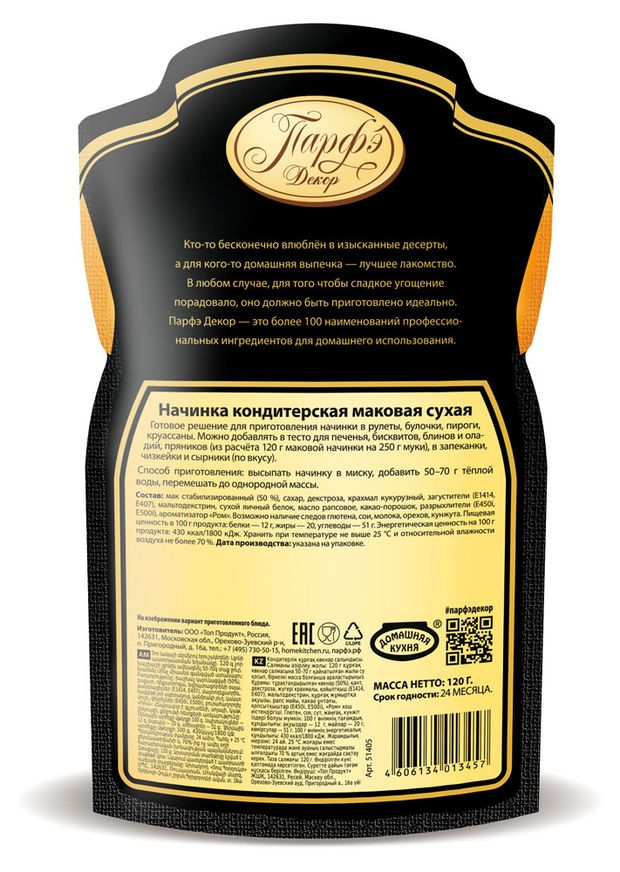 Начинка маковая Домашняя кухня — сбалансированный продукт, который подойдет для приготовления кондитерских изделий в домашних условиях. Просто разведя ее в воде в пропорциях, указанных на упаковке, начинку можно добавлять в рулеты, булочки, пироги. Плотная консистенция смеси не позволит ей проникнуть в структуру теста: она останется отдельным слоем, с самостоятельным насыщенным вкусом. Кроме того, продукт обогатит маковым ароматом глазурь, подобранную для украшения выпечки. Продукт высококалорийный, а потому его можно использовать в изделиях из пресного теста, без добавления сливочного масла и натурального молока.