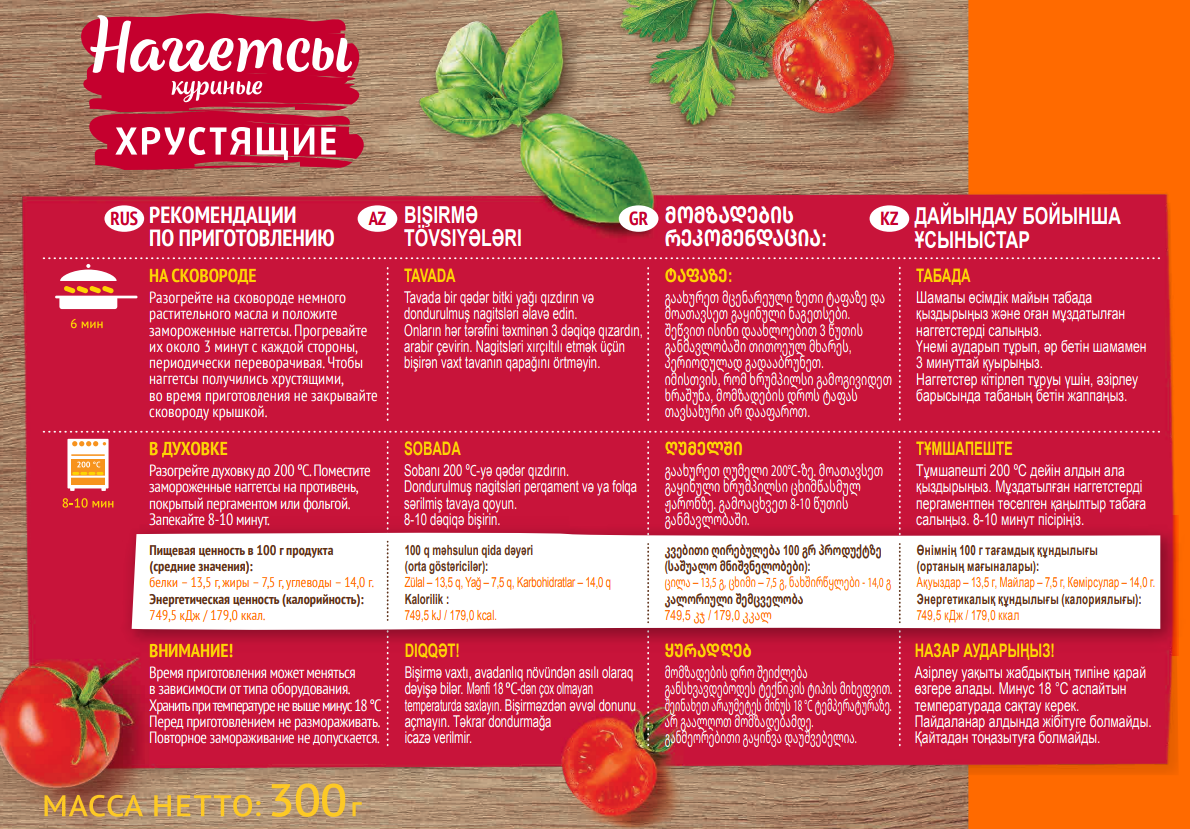 Наггетсы Мираторг куриные хрустящие замороженные 300 г – аппетитный и вкусный продукт, на приготовление которого уйдет не больше 15 минут! Наггетсы уже обжарены. Их нужно только достать из упаковки и разогреть на сковороде или в микроволновой печи. Сочные внутри и хрустящие снаружи – от такого угощения не откажутся даже дети. К готовому блюду прекрасно подойдут любимые соусы, кетчуп, майонез, горчица и аджика. В качестве гарнира можно выбрать воздушное картофельное пюре, рис или гречку, свежие или тушеные овощи. А газированные напитки идеально дополнят это блюдо. Наггетсы сделаны из натурального куриного филе, в котором содержится много полезного для организма человека белка. Именно поэтом продукт быстро утоляет голод и дает ощущение сытости на длительное время. Наггетсы – прекрасный вариант как для повседневного стола, так для праздничного. Им всегда рады как взрослые, так и дети. К тому же такой продукт можно взять с собой на дачу или на пикник и приготовить их на мангале. Повторное замораживание не рекомендовано. Мираторг — ведущий производитель и поставщик мяса на российском рынке. Компания заботится об окружающей среде, соблюдает стандарты биологической безопасности и придерживается принципов этического ведения бизнеса. Экологичность и натуральность продукта остаются одними из очевидных конкурентных преимуществ Мираторга. Компания выращивает животных без применения антибиотиков и гормонов роста, продукция Мираторга не содержит ГМО.